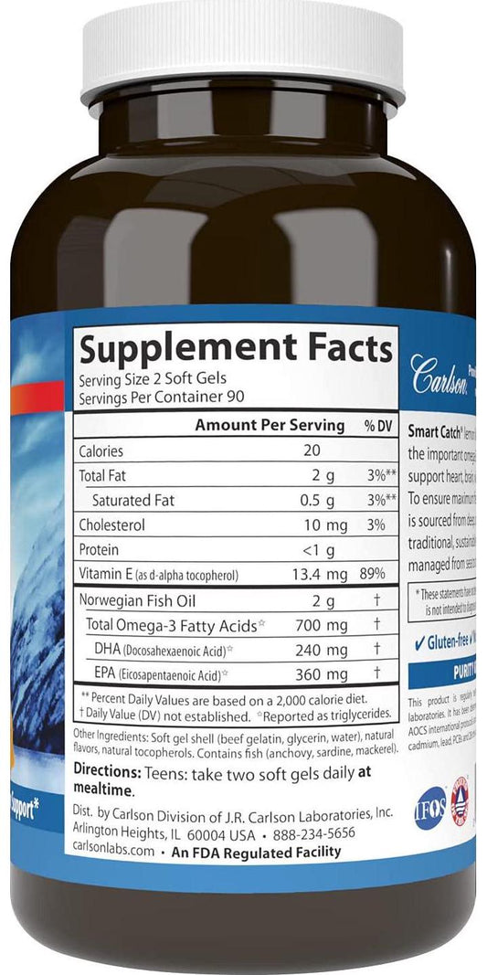 Carlson - Teen's Smart Catch, 700 mg Omega-3s, Cognitive Development, Brain Function and Vision Support, Lemon, 180 Softgels