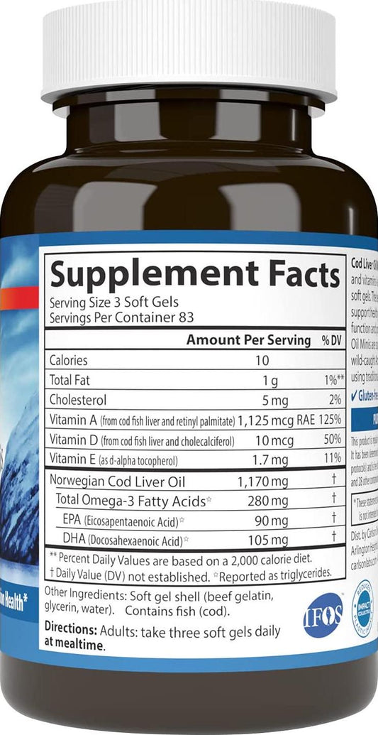 Carlson - Cod Liver Oil Minis, 280 mg Omega-3s + Vitamins A and D3, Heart Support and Cognitive Function, Vision Health, 250 Mini Soft Gels