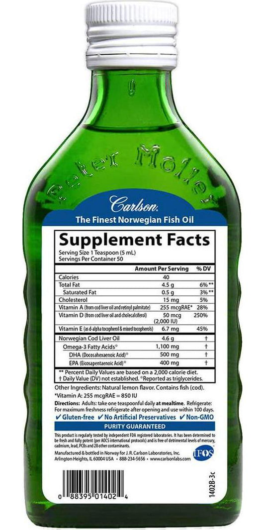 Carlson - Super D Omega-3, Wild-Caught Norwegian Arctic Cod Liver Oil, 2000 IU (50 mcg) Vitamin D3, 1100 mg Omega-3s, Sustainably Sourced Nordic Fish Oil Liquid, Lemon, 250 ml