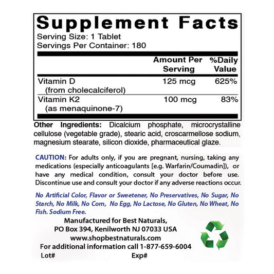 Best Naturals Vitamin D3 with K2 (MK7) 5000 IU Vitamin D3 & 100 Mcg Vitamin K2 MK7, 180 Tablets | Supports Supplement Bone and Heart Health