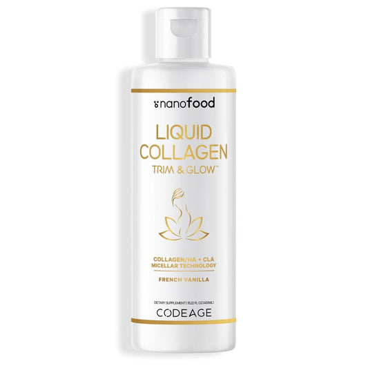 Codeage Nanofood Liquid Collagen Trim & Glow, Conjugated Linoleic Acid, Hyaluronic Acid, Hydrolyzed Collagen Type I, II, III, Whey Protein, Liposomal Delivery, Vanilla Flavor, 15.22 Fl Oz