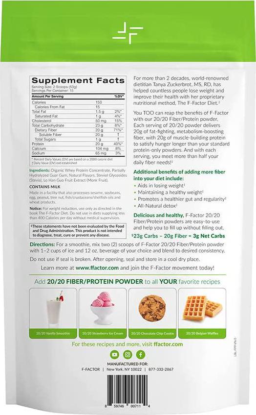 F-Factor Vanilla Shake Flavored Powder, Protein Powder for Shakes, 20g of Protein and Fiber Per Serving, 2 Net Carbs Per Serving, Whey Protein, All Natural, No Added Sugar, Soy Free, Gluten Free