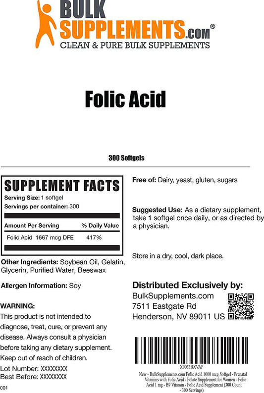 BulkSupplements.com Folic Acid 1000 mcg Softgel - Prenatal Vitamins with Folic Acid - Folate Supplement for Women - Folic Acid 1 mg - B9 Vitamin - Folic Acid Supplement (300 Count - 300 Servings)