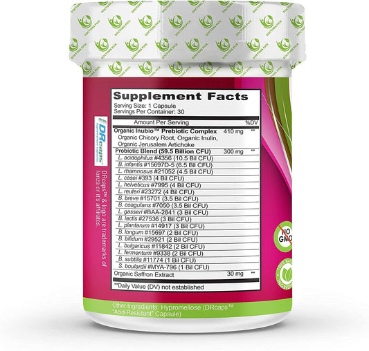 Doctors Pick Womens Probiotic | Based on 187 Clinical Trials – Patent-Pending Organic Prebiotic with Inulin, 59.5 Billion CFU + Saffron for Digestive, Immune, Vaginal, Mood, 30 Vegan Caps