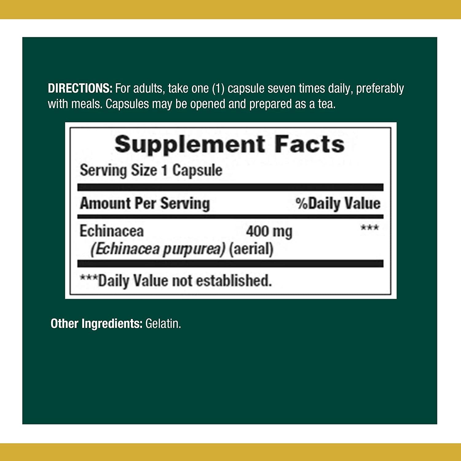 Nature's Bounty Echinacea & Goldenseal is one of the worlds leading herbs for immune system support. Echinacea promotes the bodys natural defense system. These capsules can be used any time of the year.