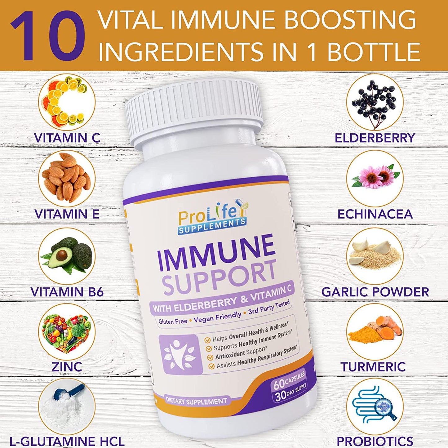 - Made in the USA, our Immune Support 10 in 1 is the best and the most complete supplement, with a rich and pure blend of ingredients, packed with Zinc, Vitamin C, E, B6, Probiotics, Elderberry, Turmeric, Echinacea, garlic, and L-Glutamine. Prolife Immune Support is the perfect formula to keep your Immune System strong.
