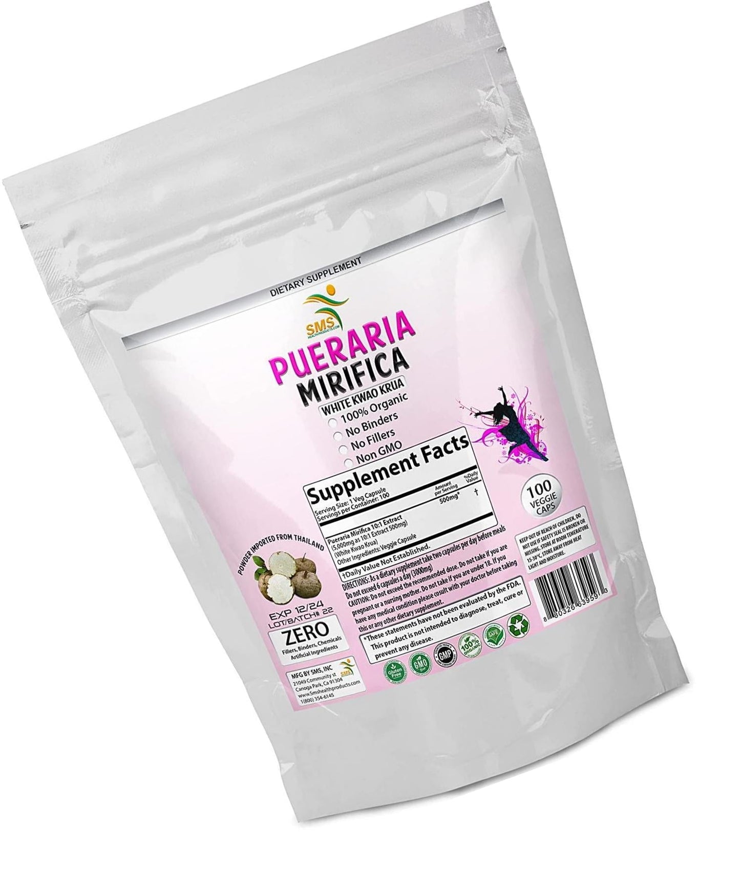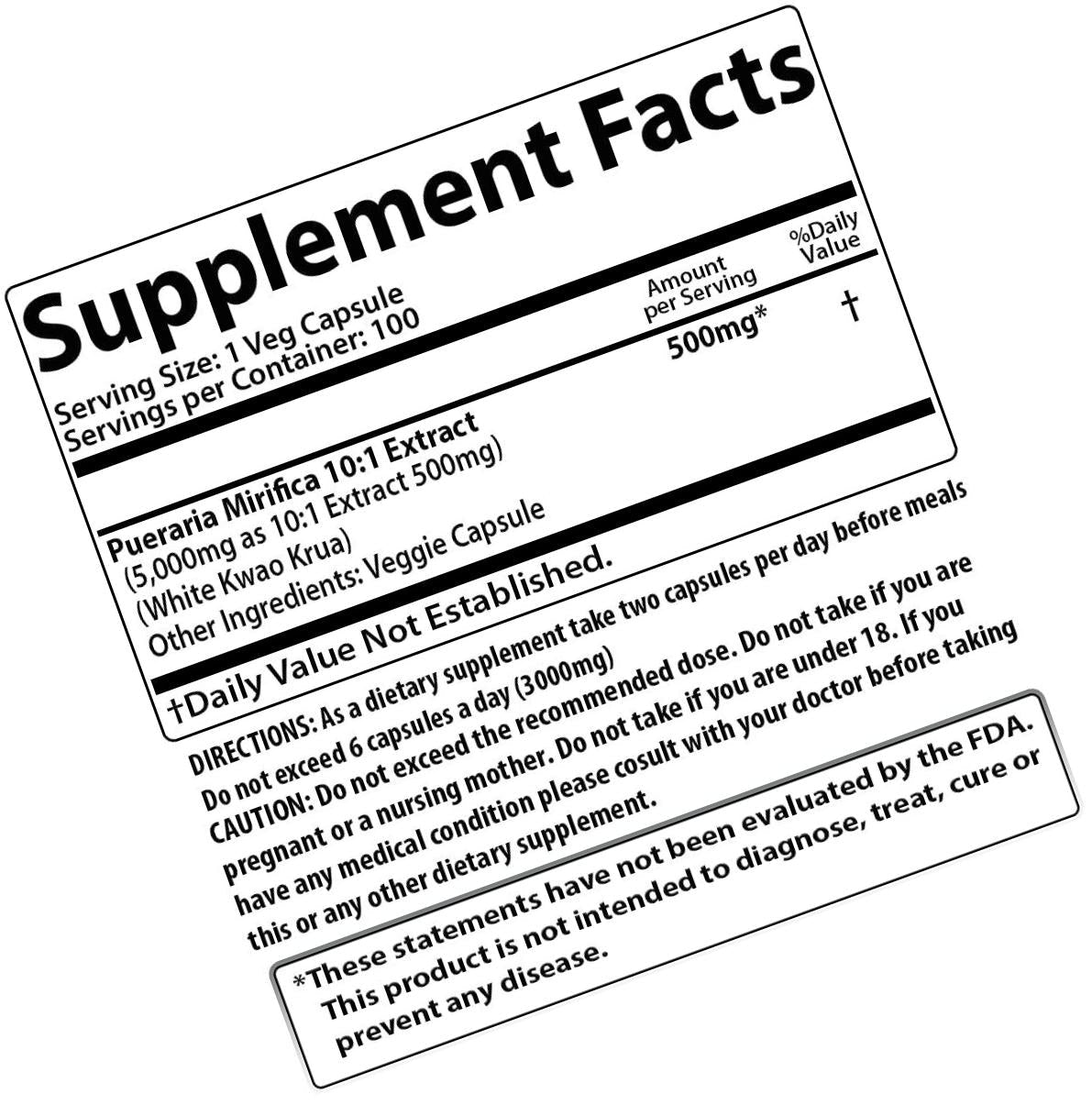 Directions: Take 1 capsules before food, morning and evening with a glass of water (2 capsule per day) Do Not Exceed 6 capsule a day. (3,000mg) 1 Bag Total 100 Capsules SUPPLEMENT FACTS: 500mg of Pueraria Mirifica 10:1 Extract 500mg per 1 capsules Serving Size: 1 capsules Servings Per Container: 100 Servings *Daily Value not established OTHER INGREDIENTS: Veggie (capsule) Suggested Use. Take one capsule one hour before food, morning and evening with a glass of water (2 Capsules Per Day In Total) or as directed by your health care professional. These statements have not been evaluated by the Food and Drug Administration. This product is not intended to diagnose, treat, cure or prevent any disease. Always consult your health care provider before taking any supplements. Pregnant or lactating women, people with existing medical conditions, or people taking medications should consult their health care provider/s before taking any dietary supplement. If you experience any adverse condition after taking this dietary supplement, discontinue use immediately and consult your health care provider. Keep out of reach of children.