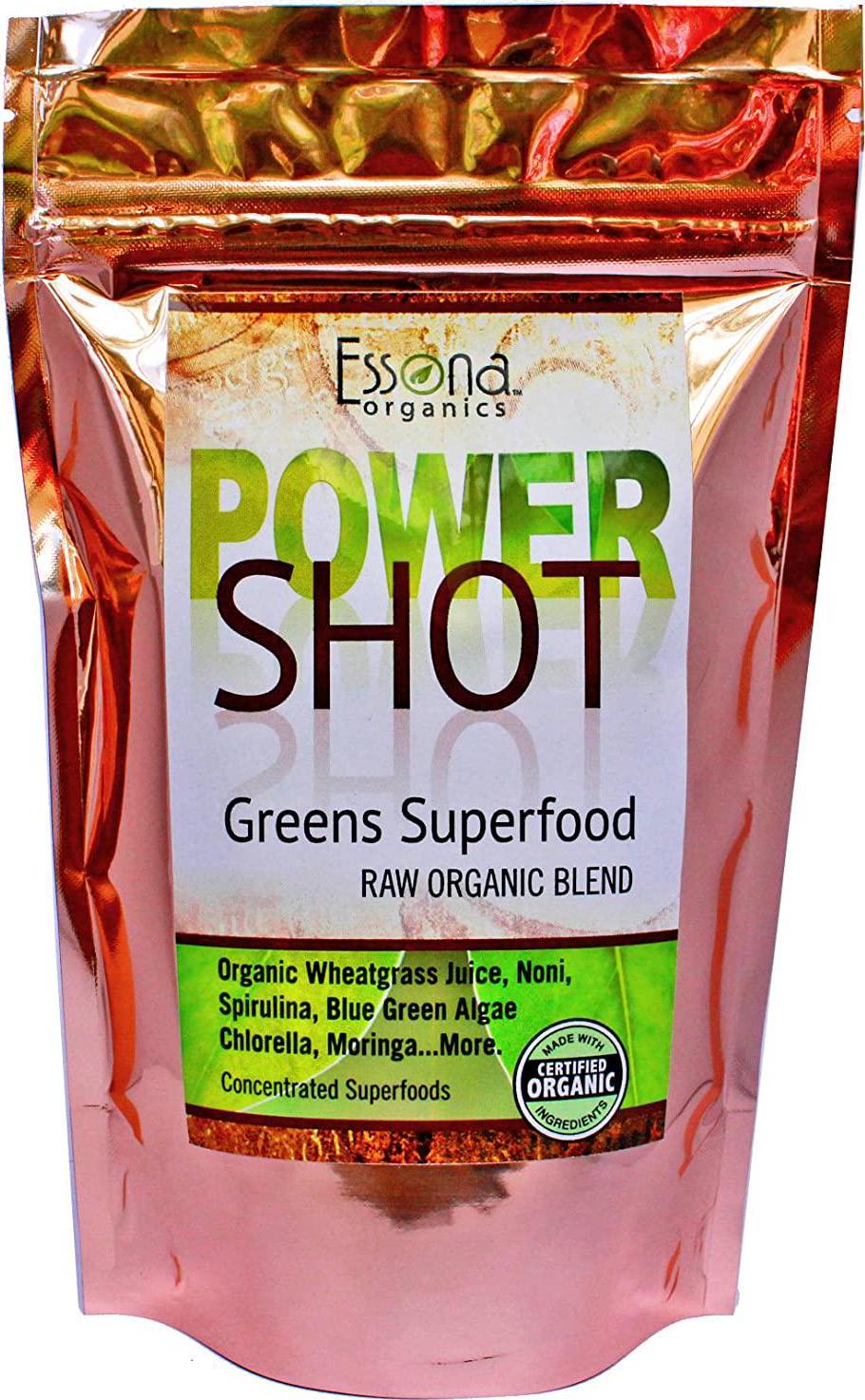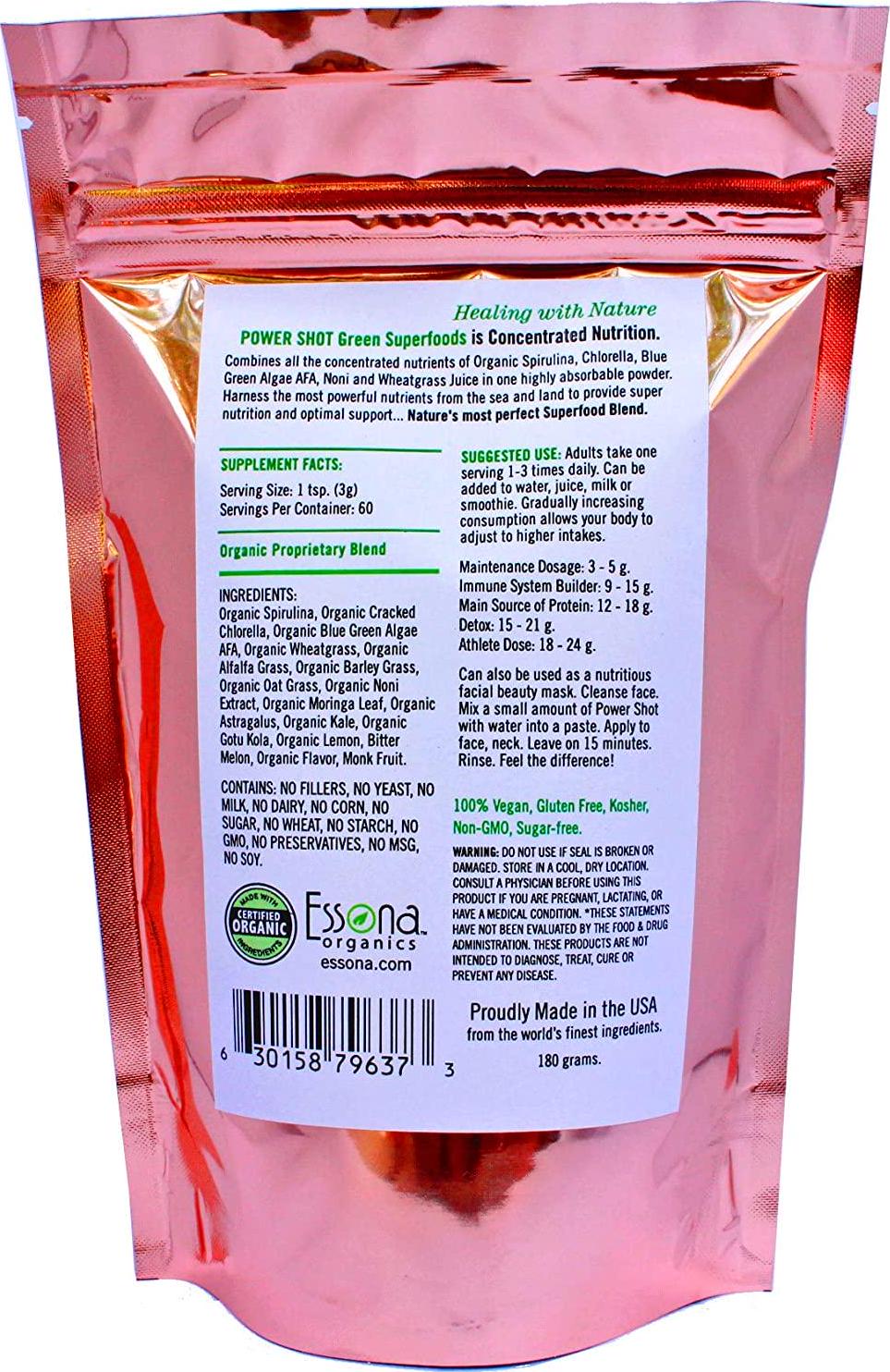 100 % Pure - RAW Organic Vegan - Power Shot Greens Superfood Blend - Spirulina, Chlorella, Wheat Grass, Blue-Green Algae, Moringa + - 60 Servings from Essona Organics, Powder - 180 GMS. Order Today!