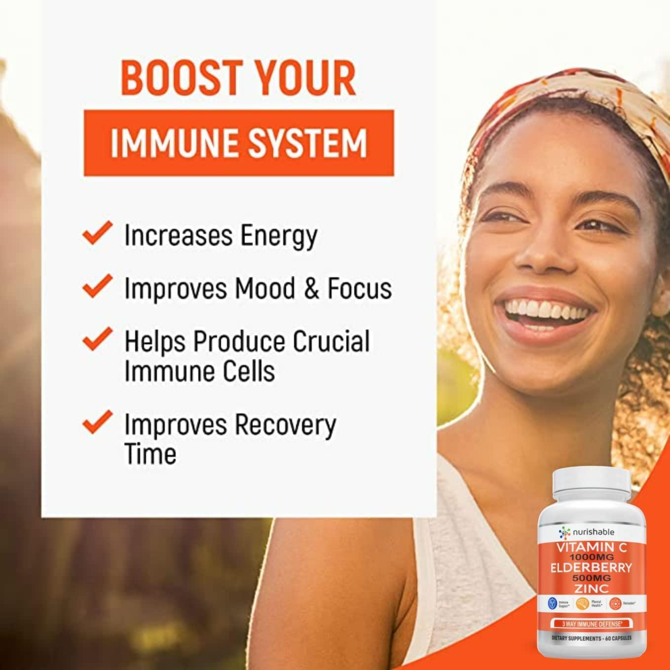 - BOOST YOUR IMMUNE SYSTEM with a 3-in-1 immune booster of 1000mg Vitamin C with Elderberry and Zinc, which may help support your blood pressure, enhance your physical health and make you feel active and energetic