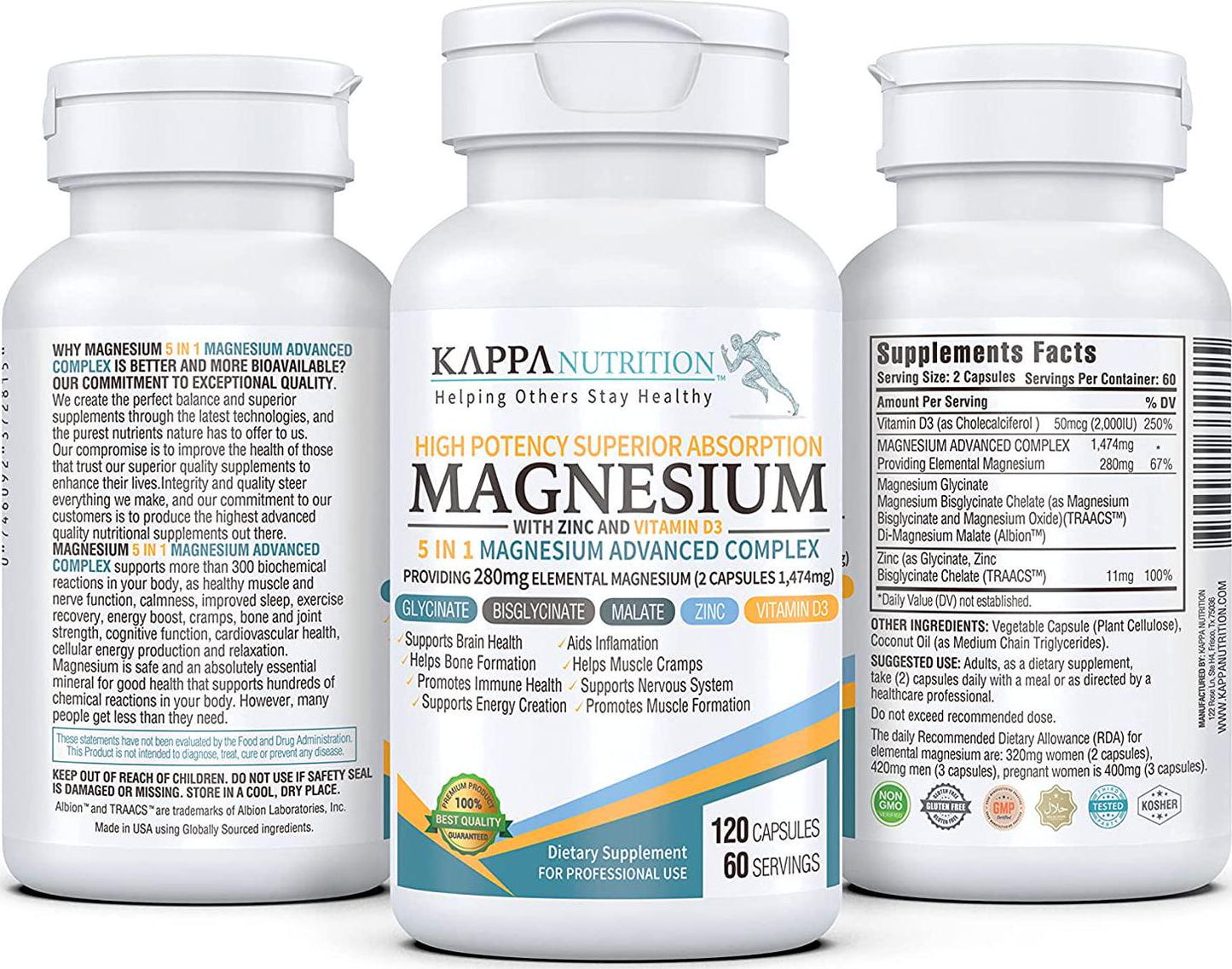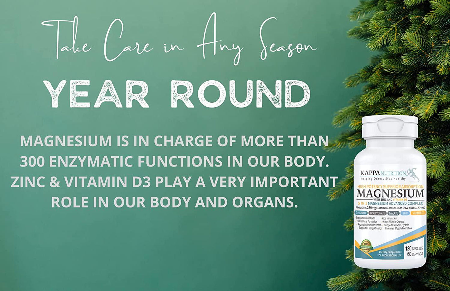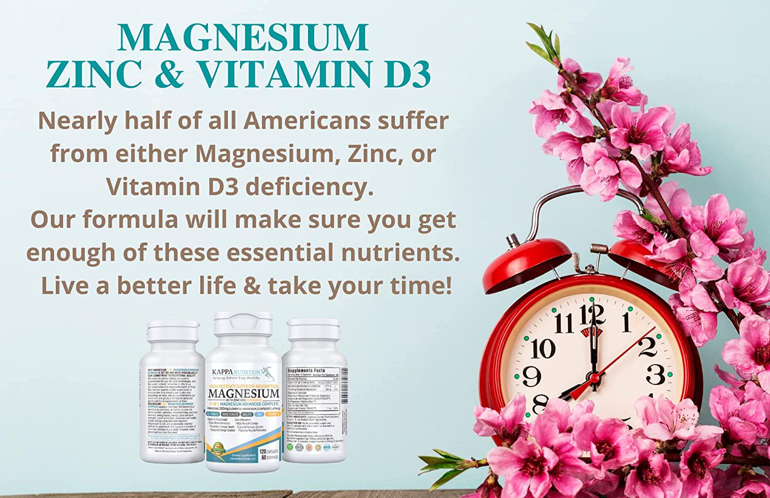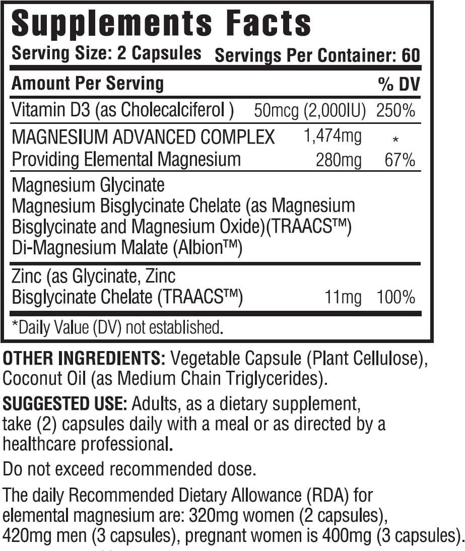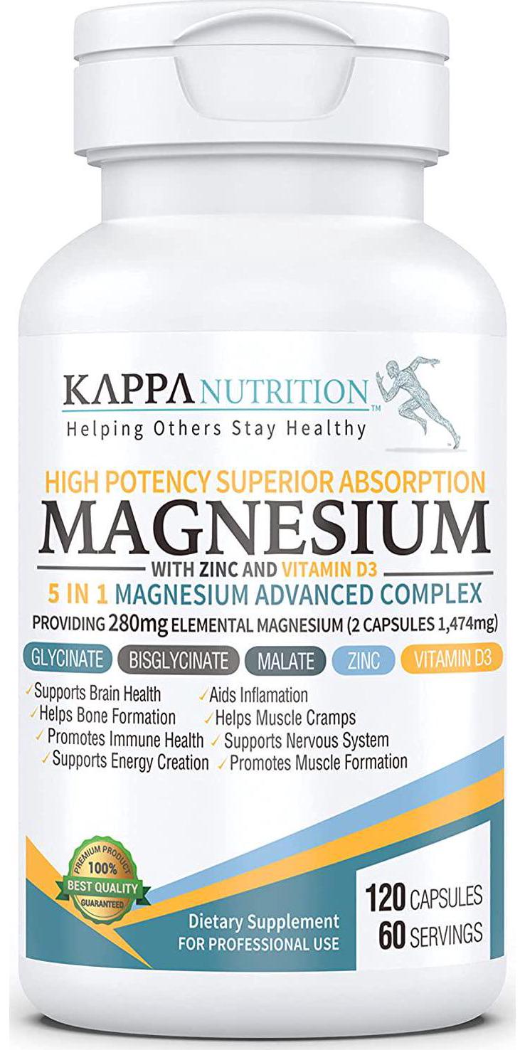 (120 Capsules), Per Serving, Providing 420mg Elemental Magnesium, Glycinate, Bisglycinate, Malate, Zinc, Vitamin D3 for Brain, Sleep, Cramps, Headaches, Energy, Bones, Immune, from Kappa Nutrition.