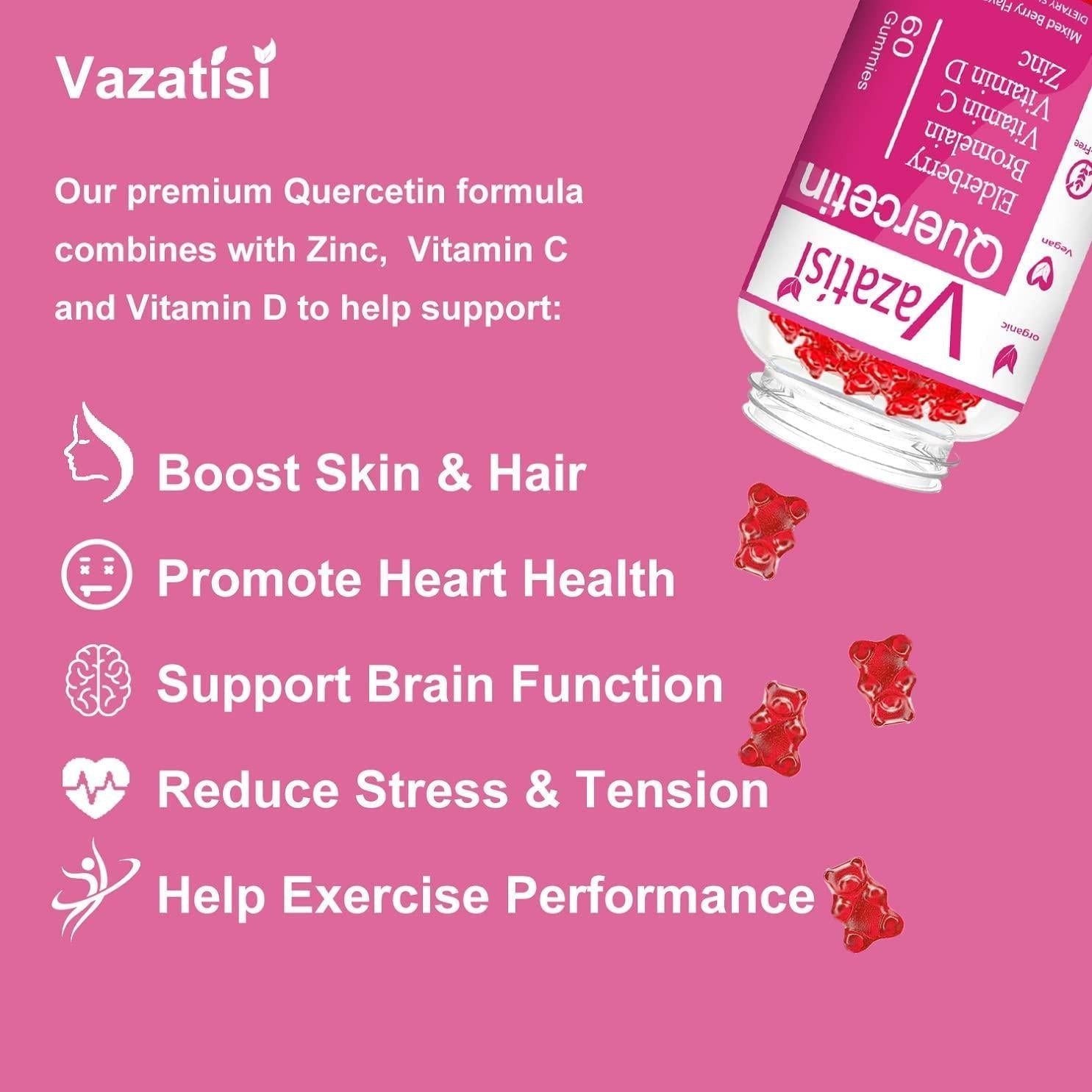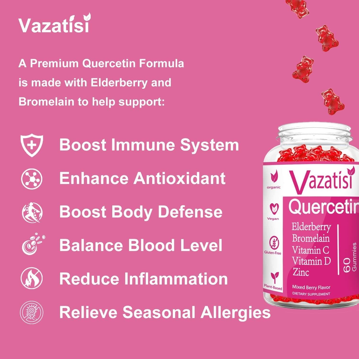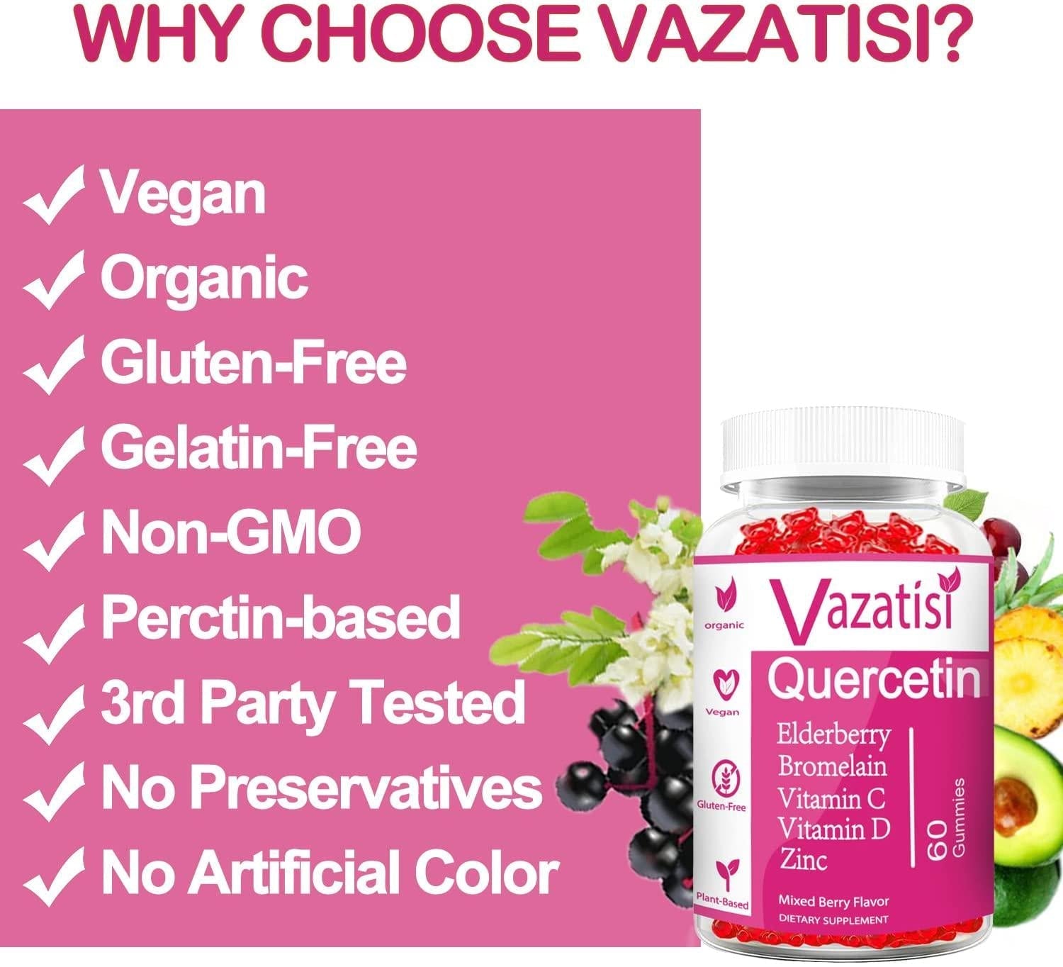 - [6-in-1 Advanced Formula, Maximize efficacy] Per serving quercetin gummies contain 800mg quercetin with 500mg ederberry, 100mg bromelain, 90mg vitamin C, 11mg zinc and 25mcg Vitamin D. Just 2 gummies a day of Vazatisi quercetin supplement can help support your overall well-being.