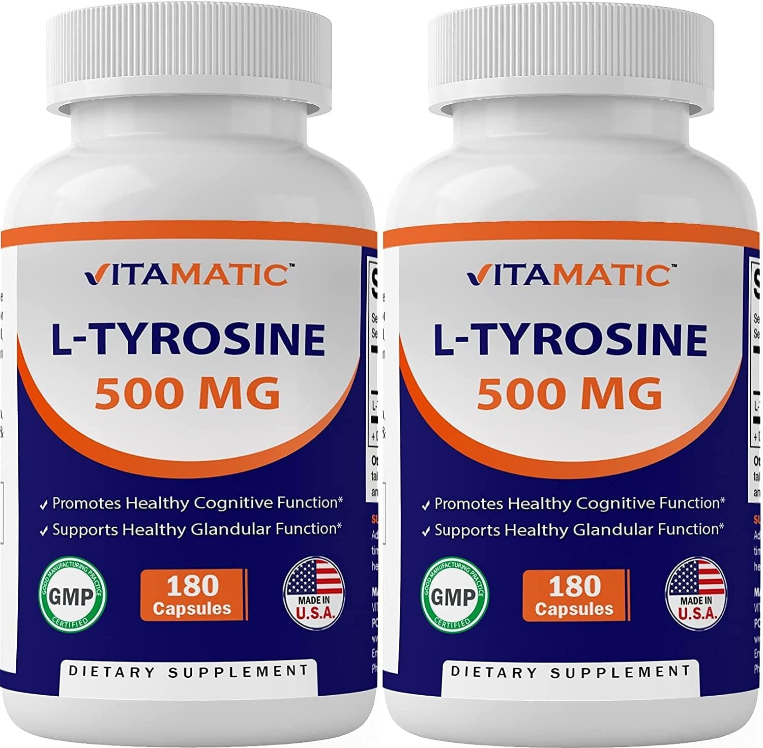 2 Pack - Vitamatic L-Tyrosine 500 mg 180 Veg Capsules - Supports Mental Clarity Promotes Alertness Boosts Energy