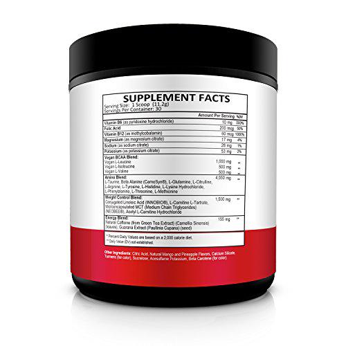 - Ingredients: Vitamin B6, Folic Acid, Vitamin B12, Magnesium, Sodium, Potassium, Vegan L-Leucine, Vegan L-Isoleucine, Vegan L-Valine, L-Taurine, Beta Alanine (CarnoSyn), L-Glutamine, L-Citrulline, L-Arginine, L-Tyrosine, L-Histidine, L-Lysine Hydrochloride, L-Phenylalanine, L-Threonine, L-Methionine, Conjugated Linoleic Acid (INNOBIO), L-Carnitine L-Tartrate, Microencapsulated MCT (Medium Chain Triglycerides) (NEOBEE), Acetyl L-Carnitine Hydrochloride, Natural Caffeine (from Green Tea Extract), Guarana ExtractSee more