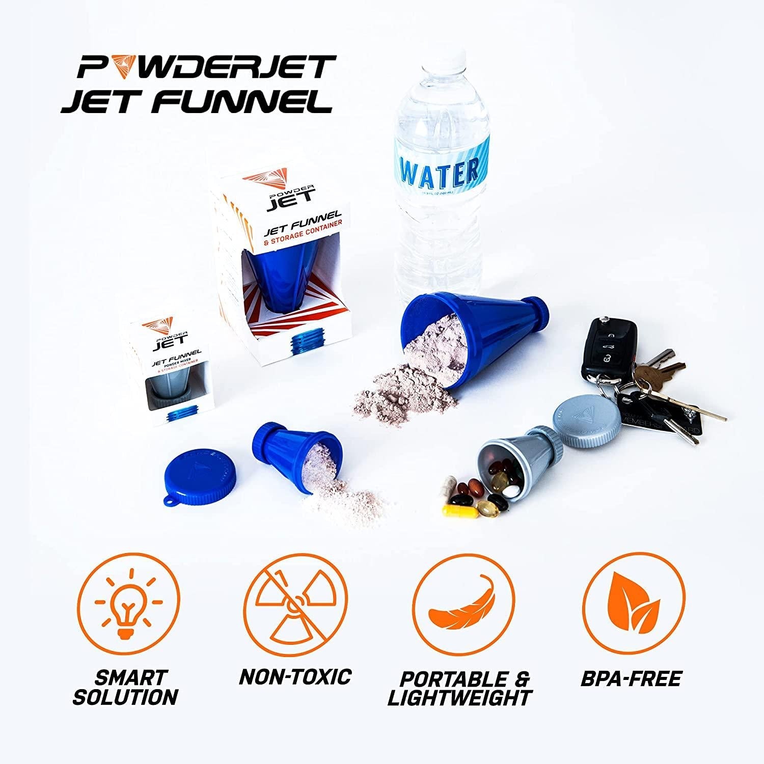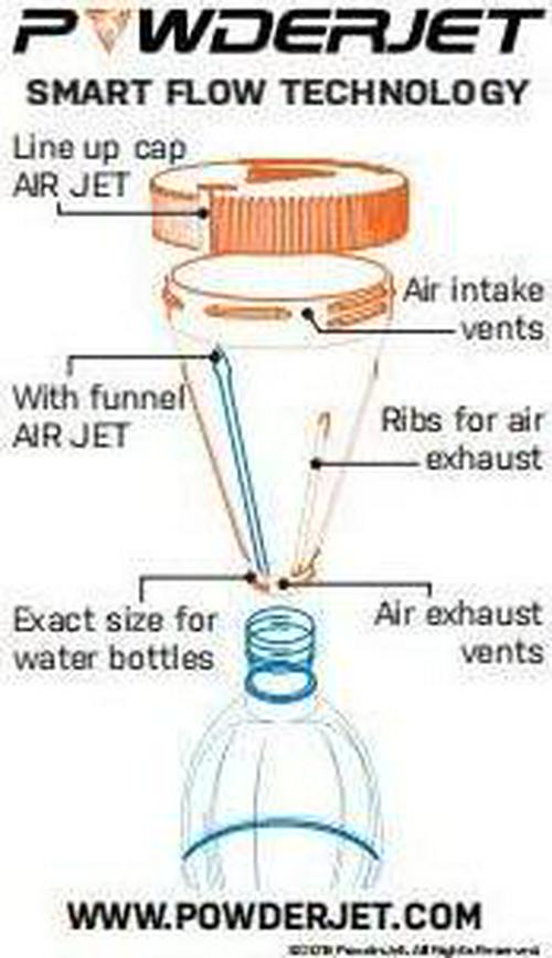 - NO MESS AND ZERO WASTED POWDER - PowderJet has a wide mouth for easy powder loading. It creates a snug fit in water bottle openings, so you don't need to hold the funnel when scooping powder into it. No mess and zero waste when loading and releasing powders into the water bottle!
