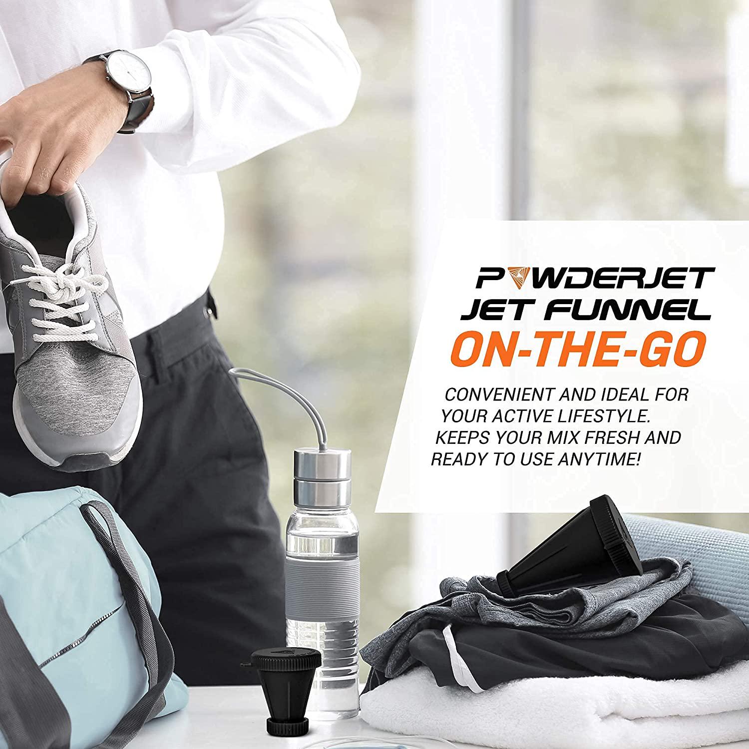 - MAKE PERFECTLY-MIXED DRINKS ON-THE-GO - PowderJet aerates the powder, so it becomes ready for mixing. You'll make perfectly mixed, clump-free drinks every time! With our protein funnel and container, you can enjoy freshly-made shakes pre- and post-workout. Just bring you powder-loaded PowderJet and a water-filled bottle, then you're good to go!