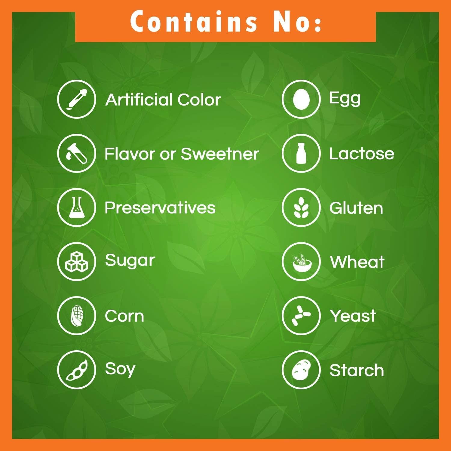 - No Artificial Color, Flavor, or Sweetener, No Preservatives, No Sugar, No Milk, No Corn, No Soy, No Egg, No Lactose, No Gluten, No Wheat, No Yeast, No Fish. Sodium Free.