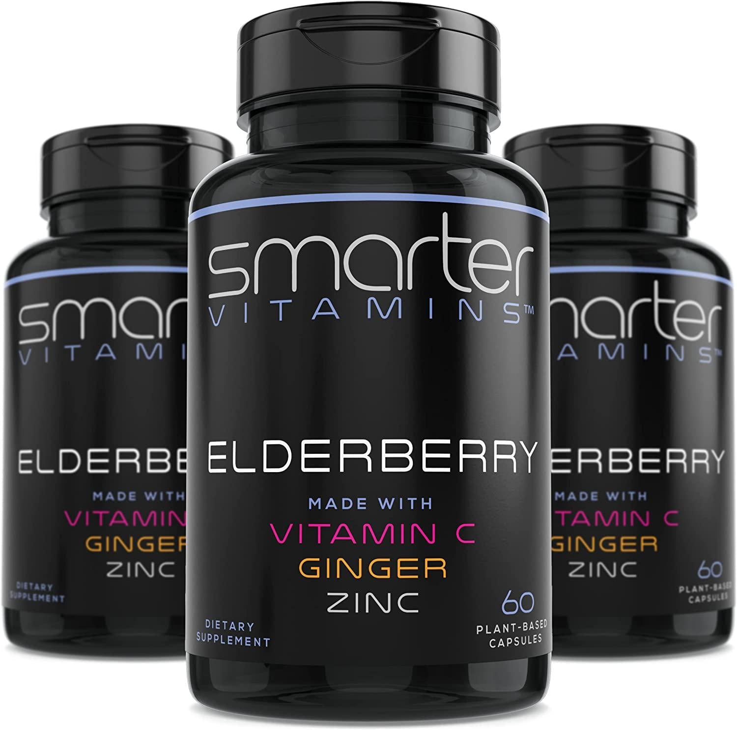 (3 Pack) Smarter Elderberry Capsules + Vitamin C + Ginger and Zinc, Herbal Supplement for Immune Support, Powerful Black Elder Berry Extract Antioxidant Vitamin, 180 Vegan Pills