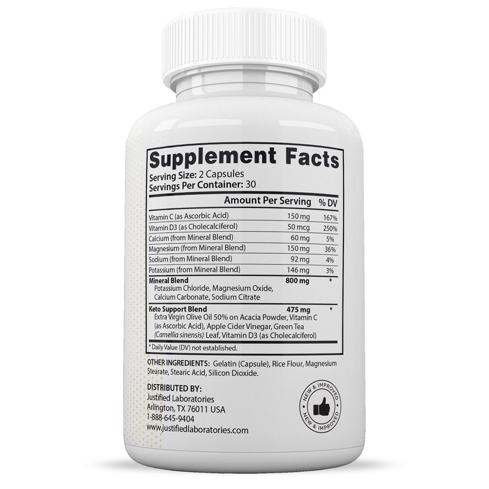 - PRODUCT ACV PILLS: Justified Laboratories Keto Pills 1275 mg Proprietary Keto formula includes magnesium, calcium and sodium, which are key nutrients your body can be depleted of during ketosis.