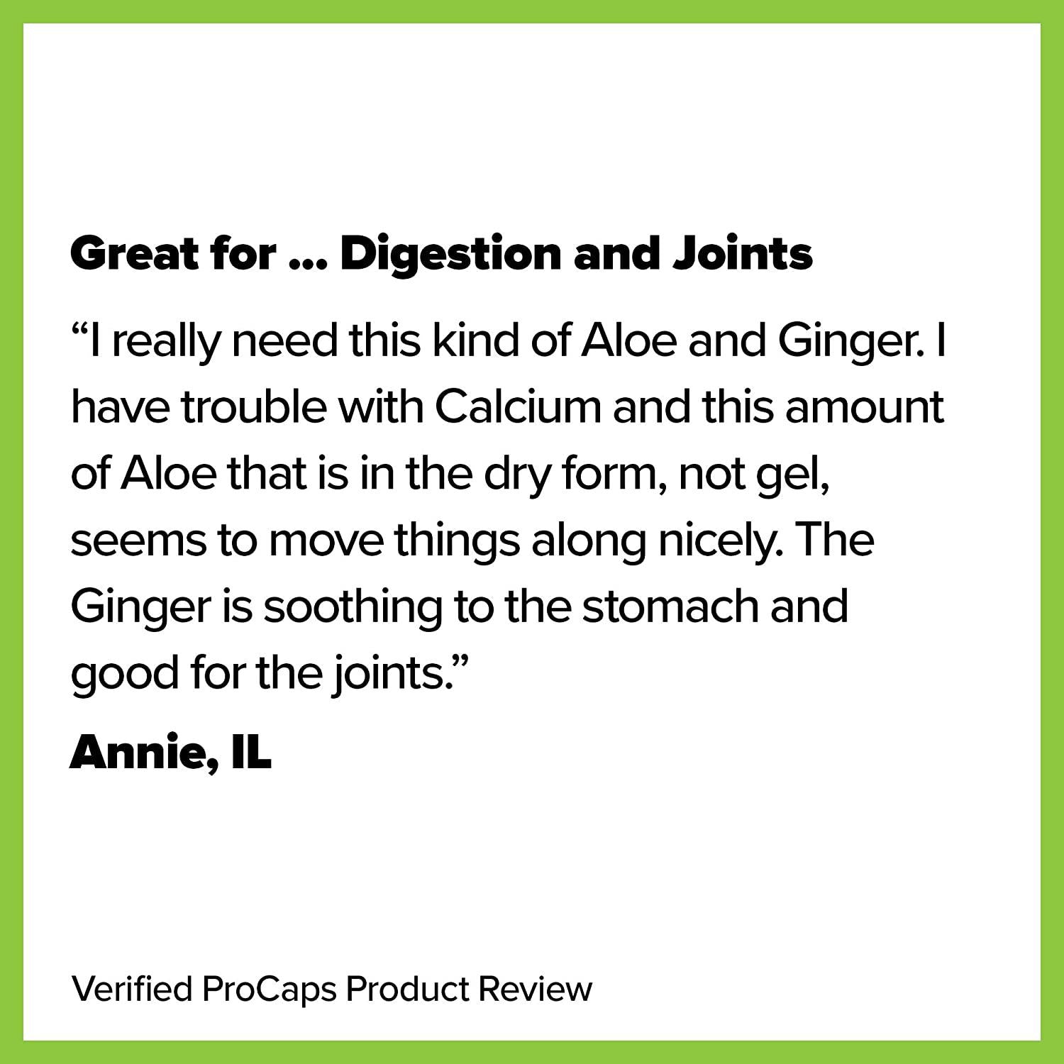 - SOOTHING RELIEF FOR DIGESTION AND JOINTS WITH ALOE VERA AND GINGER ROOT EXTRACT Supports the health and integrity of gastrointestinal lining. Requires 12 pounds of pure Aloe Vera to create just one ounce of our unique powder. Designed to calm an upset or queasy stomach, as well as to soothe and relieve our aging joints. Provides two of Mother Nature's most effective tools for soothing relief for our digestive system and hard working joints.