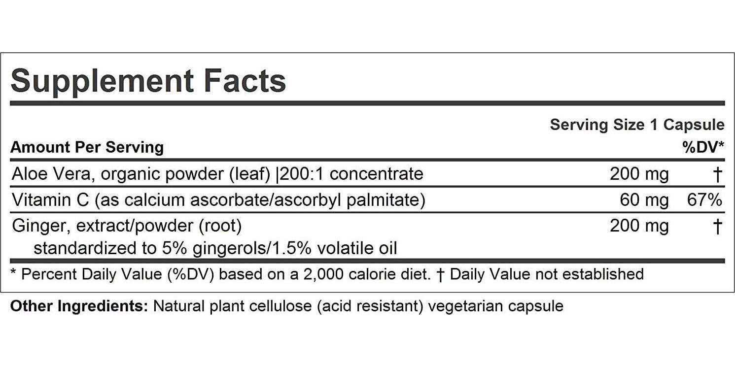 - SUPERIOR 100% PURE BIO ACTIVE INGREDIENTS Delivers 200 mg of pure cold processed 200:1 ultra concentrate Aloe Vera powder and 200 mg of Ginger extract and Vitamin C. Contains NO Milk / Dairy Free, Gluten Free; NO soy, yeast, sodium, salt, sugar, fat, cholesterol, color, preservative or manufacturing additives.