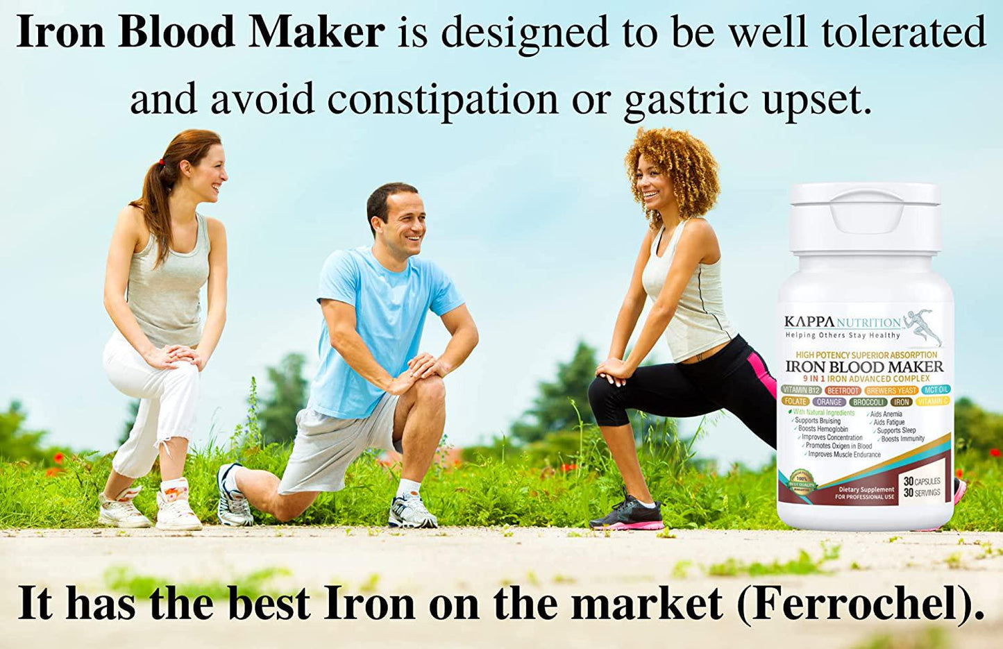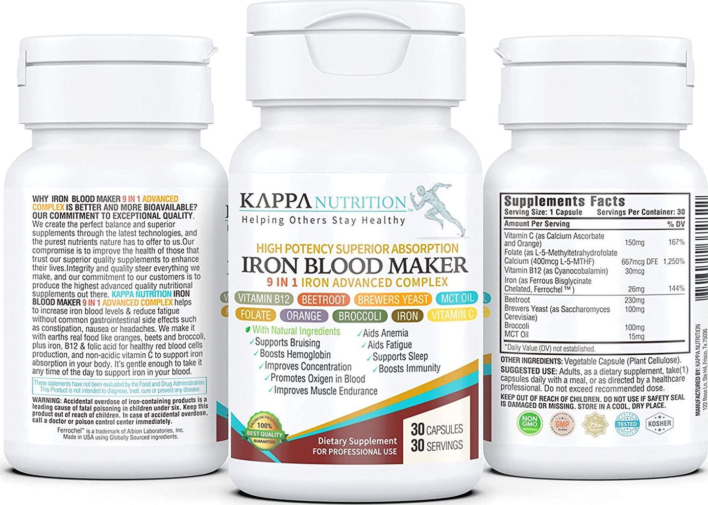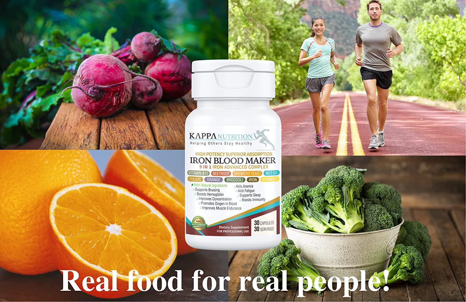 WHY IRON BLOOD MAKER 9 IN 1 ADVANCED COMPLEX IS BETTER AND MORE BIOAVAILABLE OUR COMMITMENT TO EXEPTIONAL QUALITY. We create the perfect balance and superior supplements through the latest technologies, and the purest nutrients nature has to offer to us. Our compromise is to improve the health of those that trust our superior quality supplements to enhance their lives. Integrity and quality steer everything we make, and our commitment to our customers is to produce the highest advanced quality nutritional supplements out there. KAPPA NUTRITION IRON BLOOD MAKER 9 IN 1 ADVANCED COMPLEX helps to increase iron blood levels and reduce fatigue without common gastrointestinal side effects such as constipation, nausea or headaches. We make it with earths real food oranges, beets and broccoli, plus iron, B12 & folic acid for healthy red blood cells production, and non-acidic vitamin C to support iron absorption in your body. It's gentle enough to take it any time of the day to support iron in your blood.