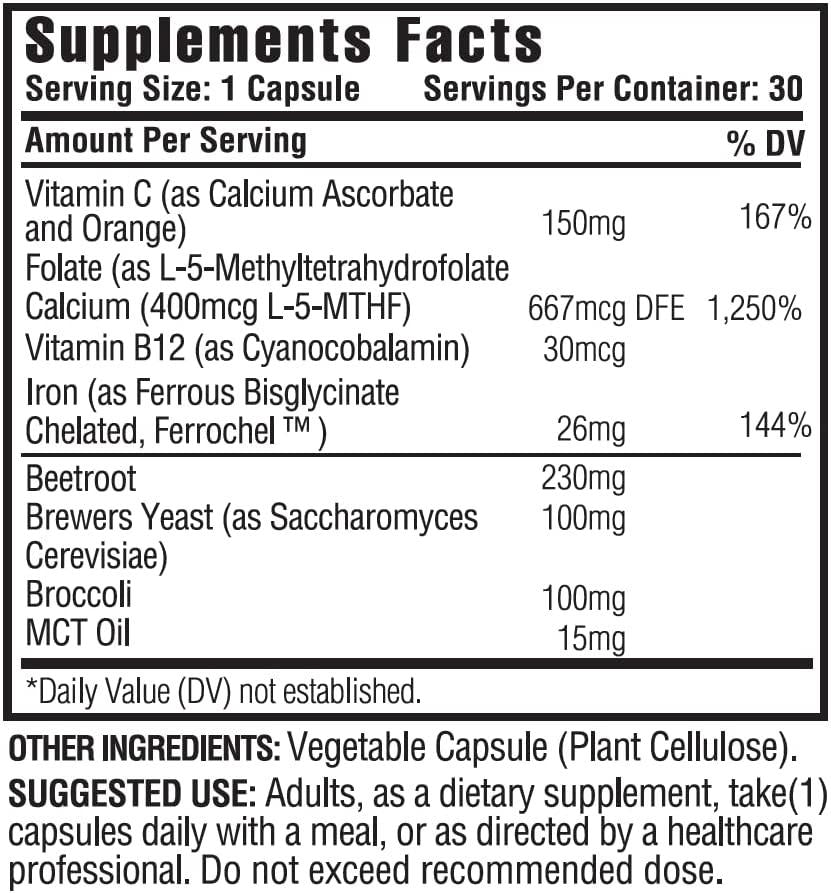 (30 Capsules), Iron 26mg, Vitamin C and Orange 150mg, Folate 667mcg DFE, Vitamin B12, Beetroot, Brewers Yeast, Broccoli and MCT Oil 9 in 1 Advanced Complex from Kappa Nutrition. (30 Capsules)
