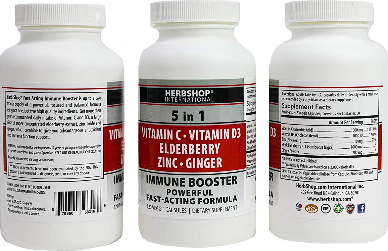 - The Big 5 – Doctor's Blend 5 in 1 Immunity Booster for adults combines the strength of five high-quality, immune-supporting ingredients. 1000mg of Sambucus elderberry combined with 200 mg of ginger help provide antioxidant support, 10 mg of zinc oxide (an essential nutrient) helps to promote immune function, and for an extra immune boost, we’ve added 5000 IU of vitamin D3 and 1000 mg of vitamin C to bring you a POWERFUL Immune supporting supplement great for any season.