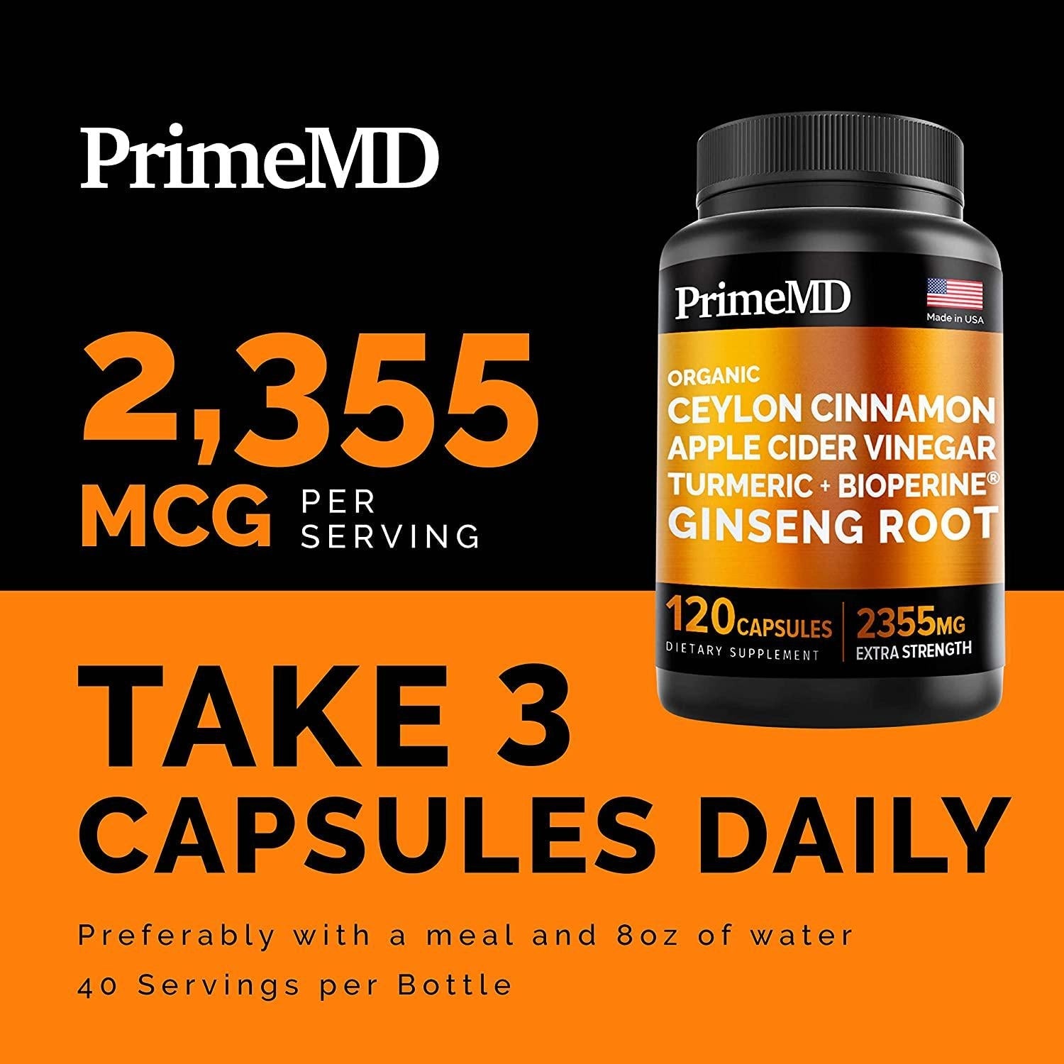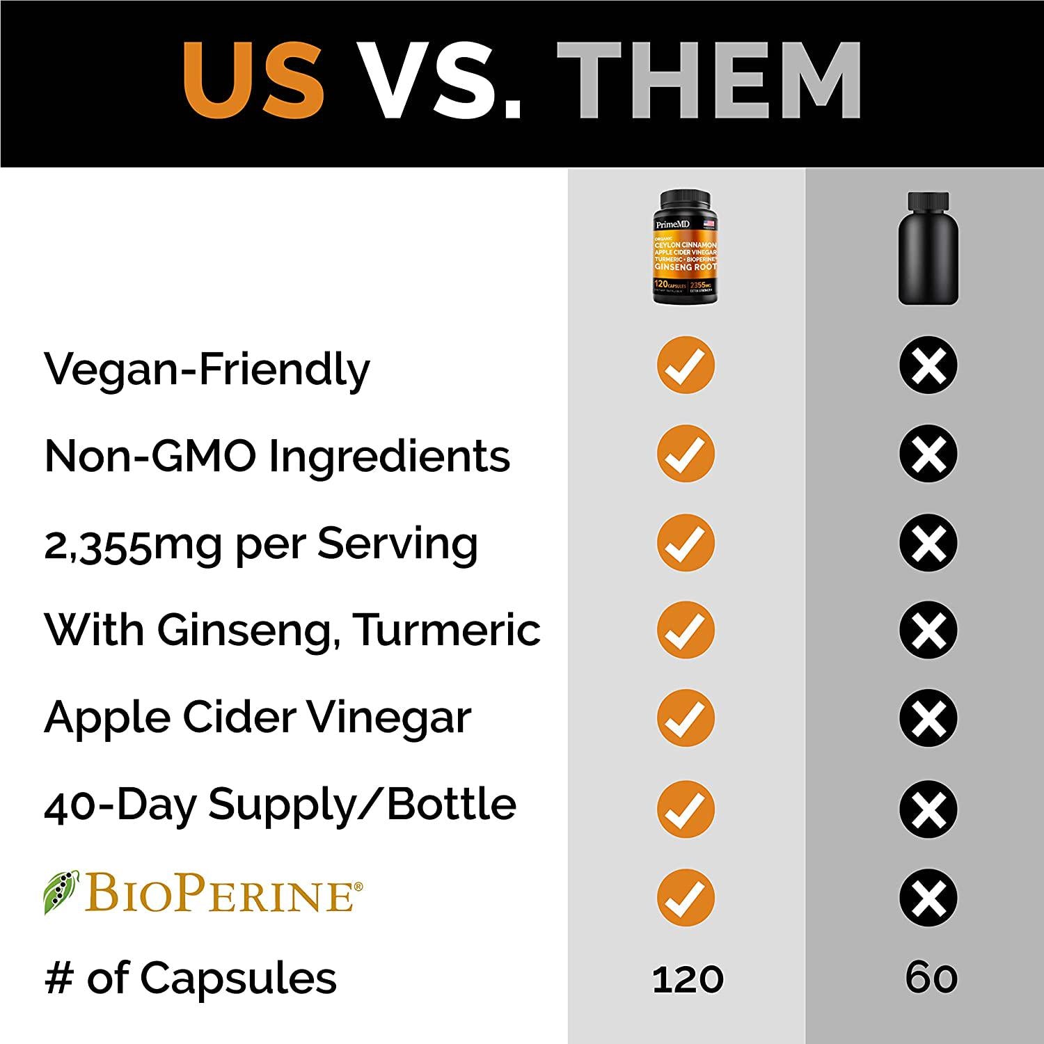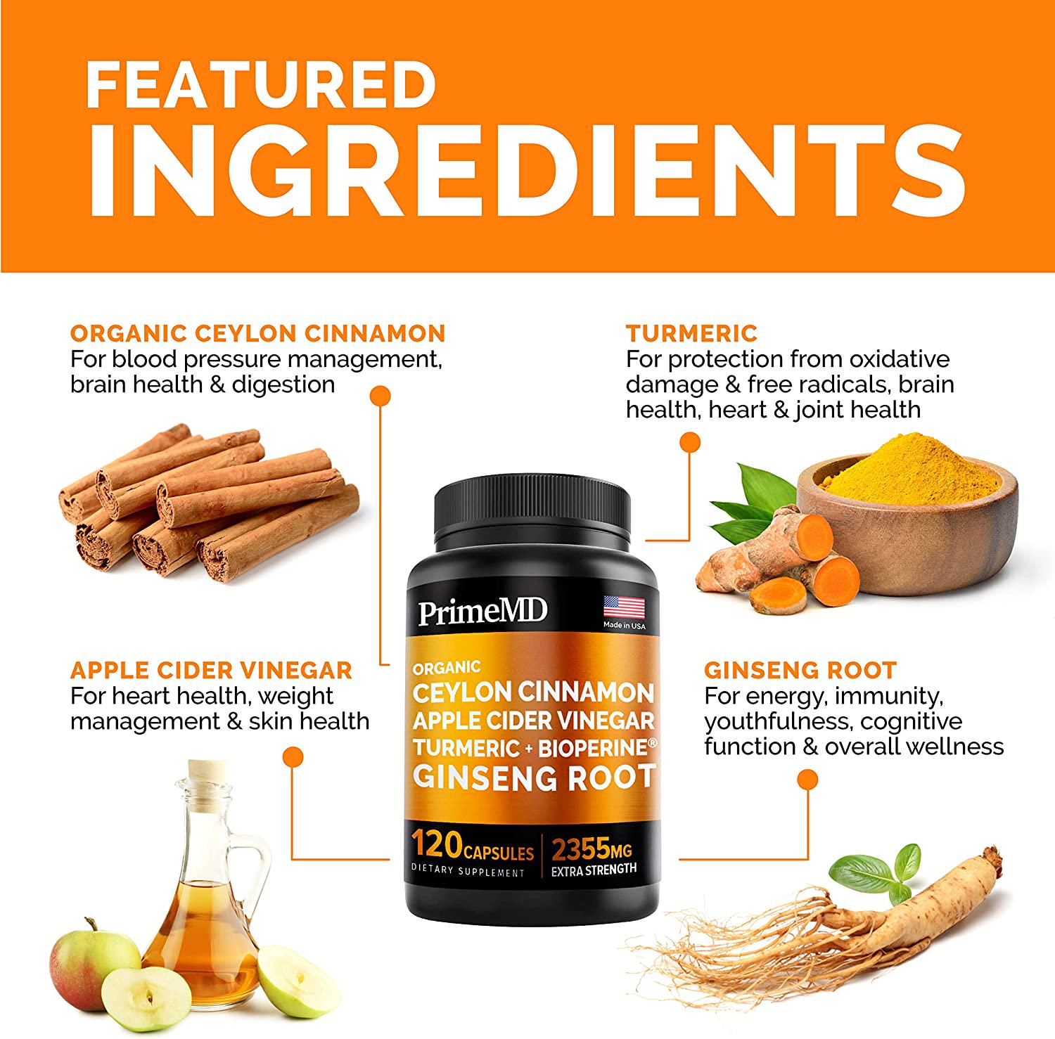 - Comprehensive Wellness Formula Tablets for Adults: Forget about taking supplements a plenty, because in just one bottle of the PrimeMD Ceylon Cinnamon Apple Cider Vinegar Ginseng Turmeric capsules, you'll get a multitude of health-boosting benefits. So whether you're having metabolism issues, struggling with glucose or blood pressure levels, or simply need to maintain a clean lifestyle, our supercharged ceylon cinnamon formula will provide the support your body needs