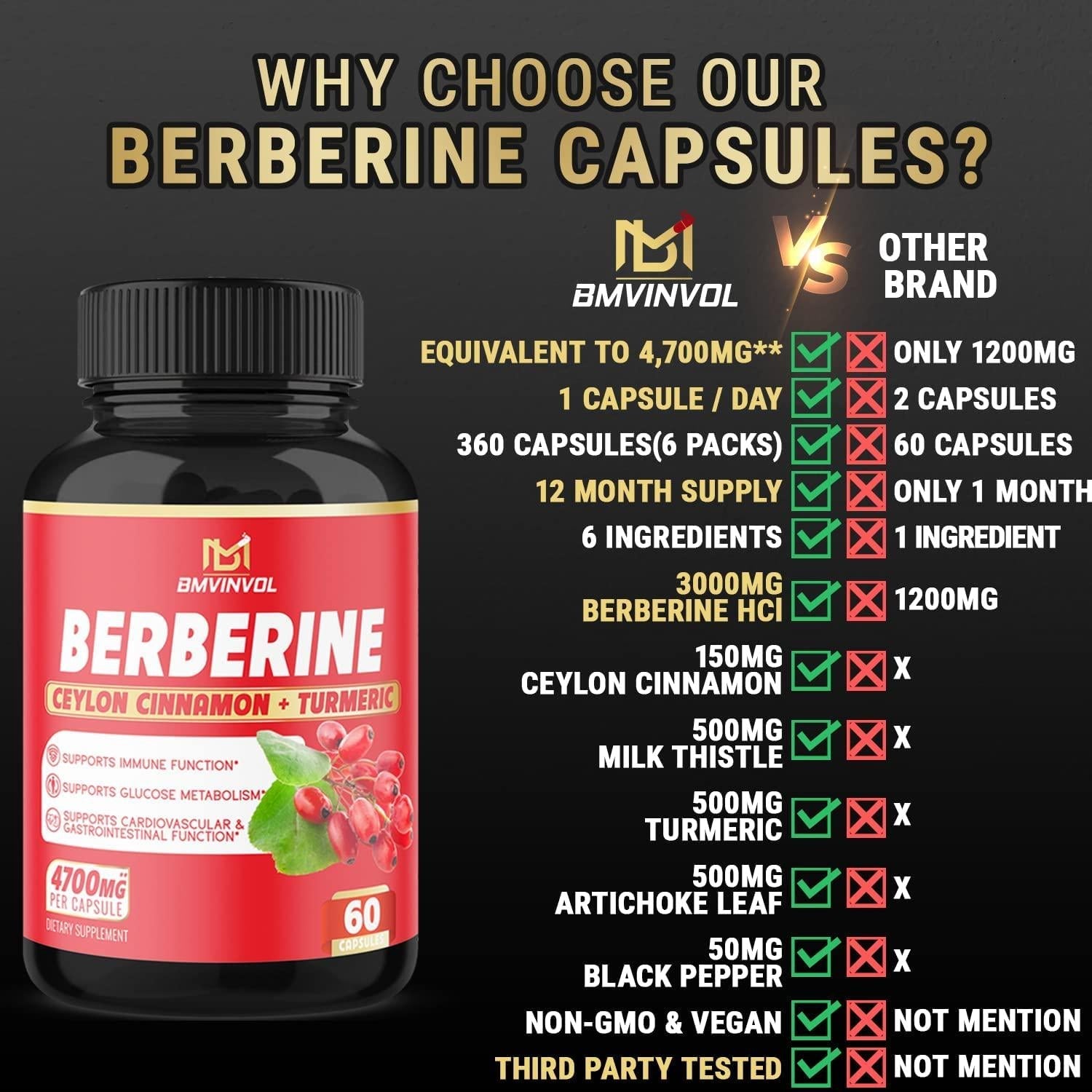 - Our Berberine contains 6 Pack with total of 360 capsules, contains up to a 12-Month supply. Plus, these capsules are easy and safe to swallow.