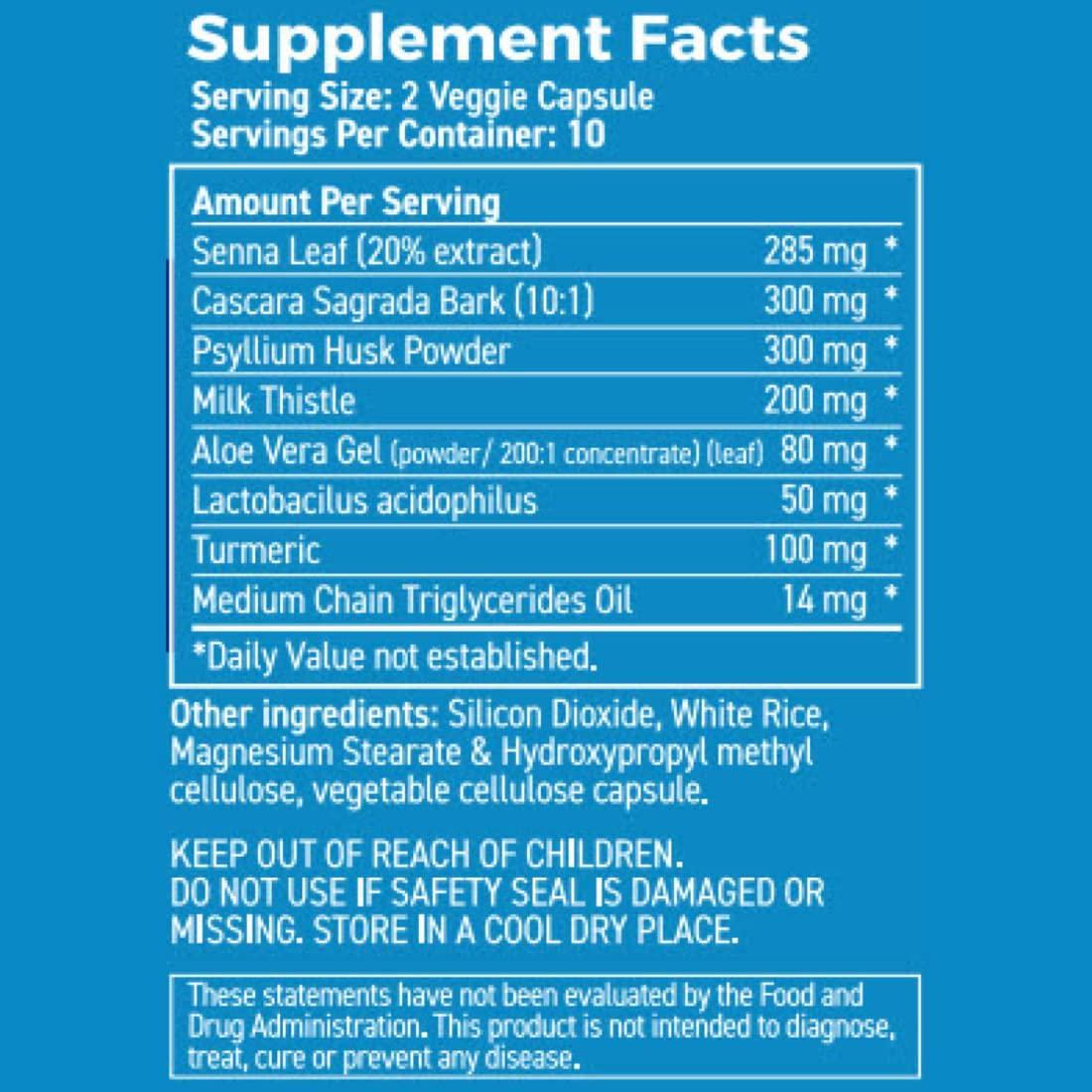 20 capsules, aloe vera, bowel colon cleanse, detox, healthy bowel movements, probiotics, psyllium fibers, usa, weight loss