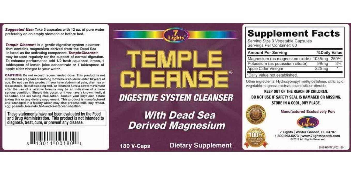 7 Lights Temple Cleanse 180 Capsules, Magnesium, Oxygen-Based Colon Cleanse Detox