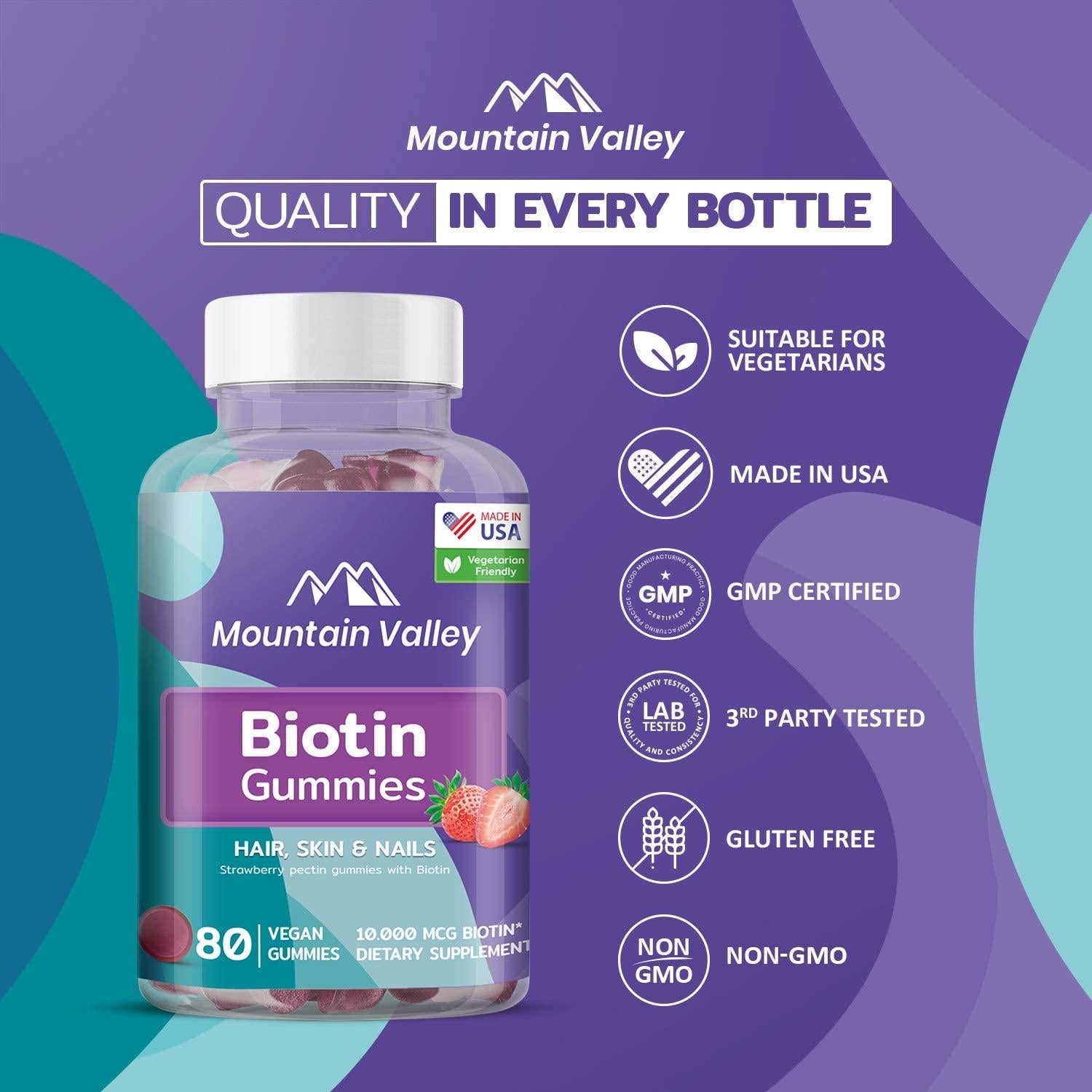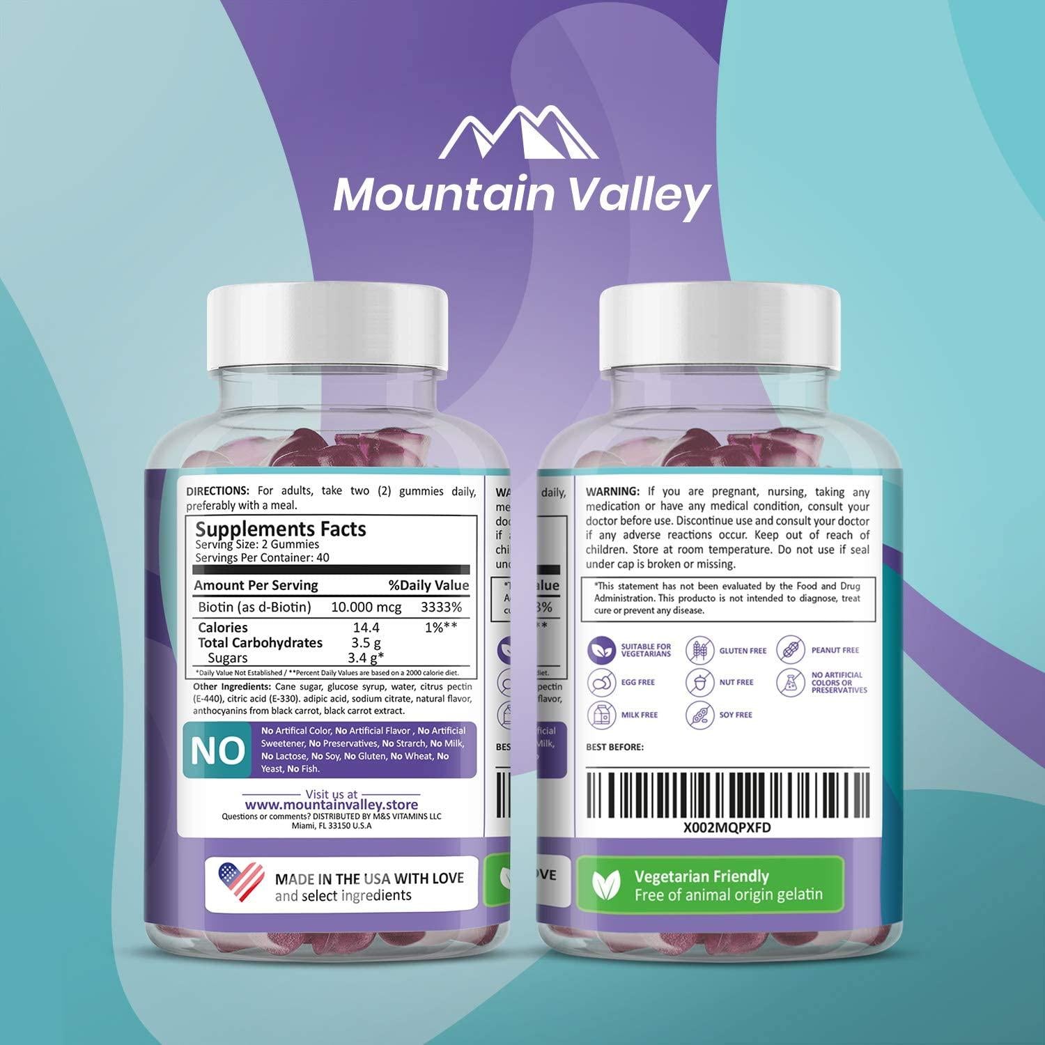 - Vegan plant-based nutritional supplement: When you decide on a biotin supplement, choose to take care of yourself with mountain valley, we have designed our biotin gummies with pectin (plant-based), we do not use gelatin or other animal products in the manufacture of our gummies, they are perfect for anyone looking a clean and ecological way to take care of yourself with vitamins in hair rubber.
