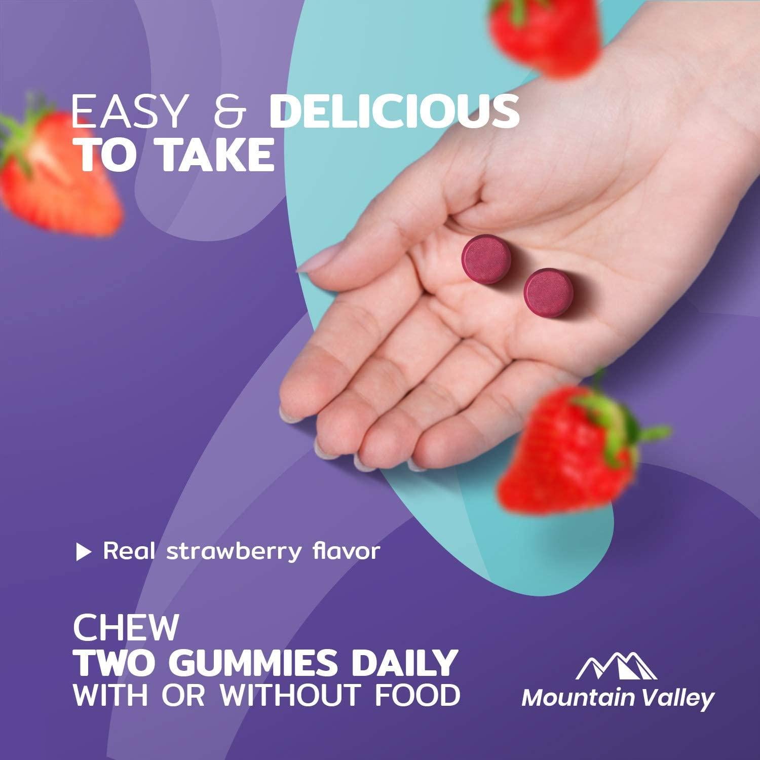 biotin gummies, delicious strawberry flavor, hair growth, hair skin nails, mountain valley, non-gmo, strawberry flavor, vegan