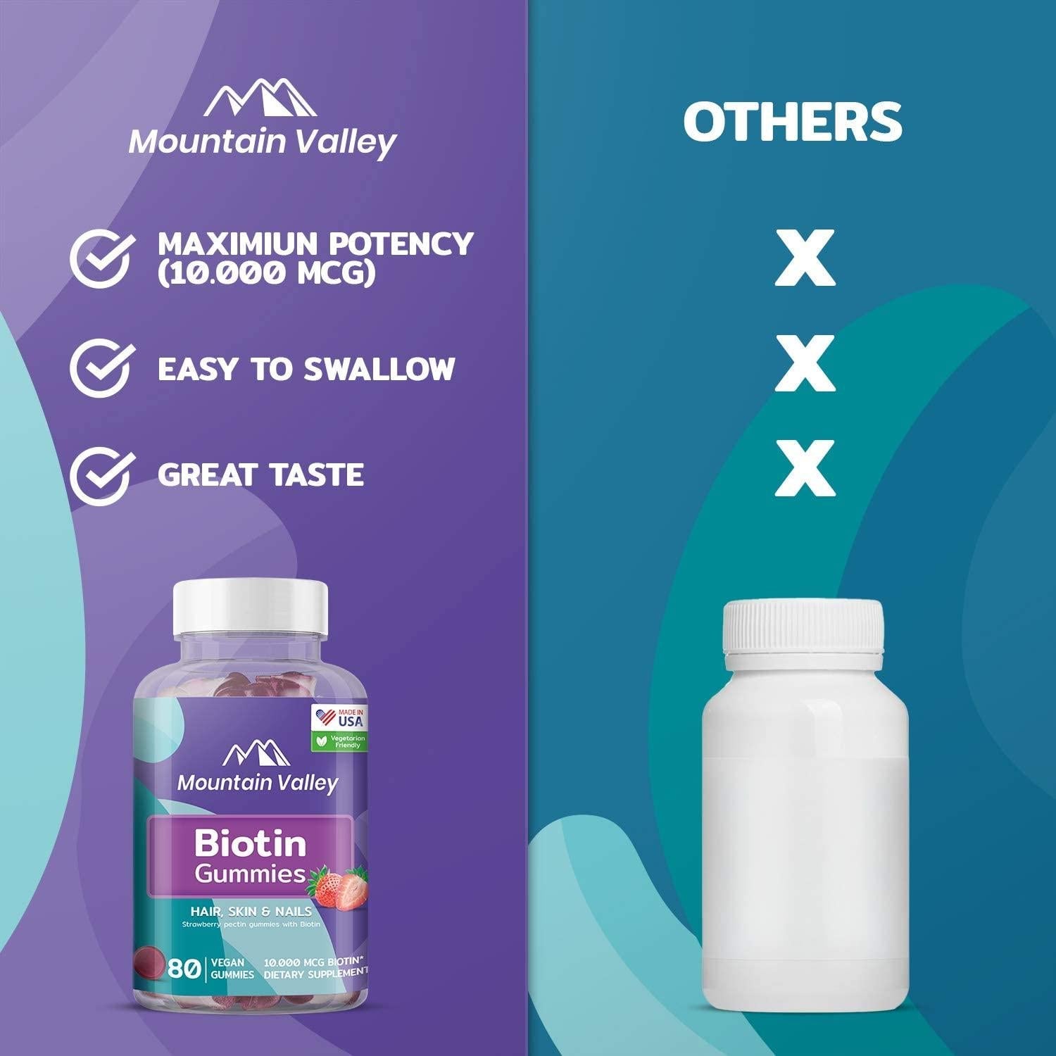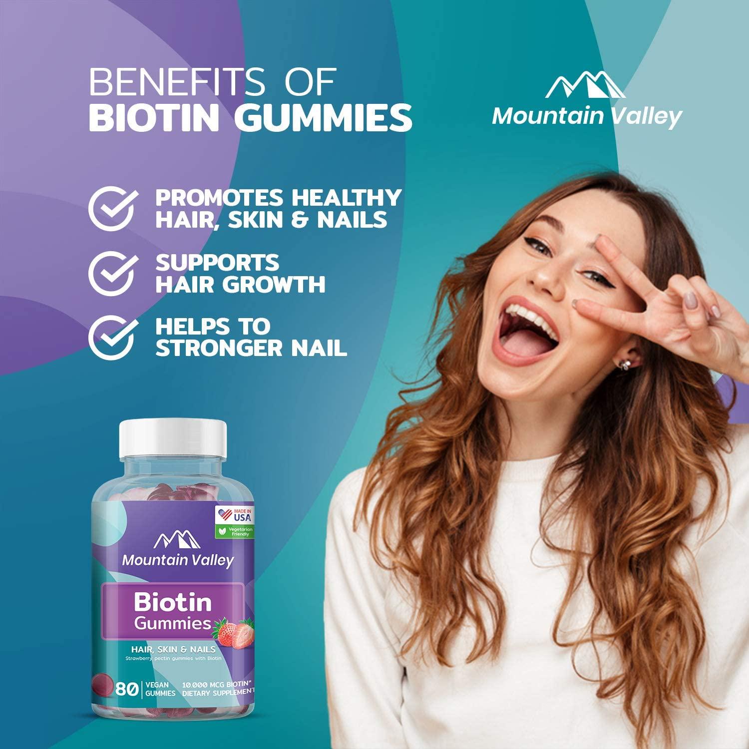 - Effective and easy: We have developed a product that not only tastes delicious, but also provides you with 10,000 mcg pure biotin in each serving, Mountain valley's biotin gummies for hair growth will help you achieve stronger, shinier and longer hair. Stimulating and nourishing the hair follicles and the scalp from within. Enjoy all the incredible benefits of our biotin hair rubbers. Designed for men, women and children.
