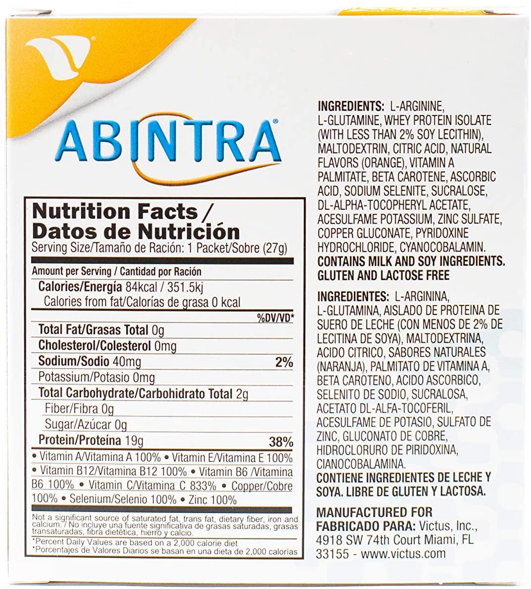 - One packet of Abintra contains specific nutrients for tissue repair. Gluten and Lactose Free. No Sugar added
