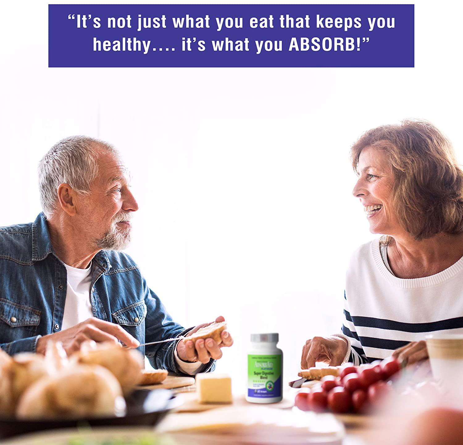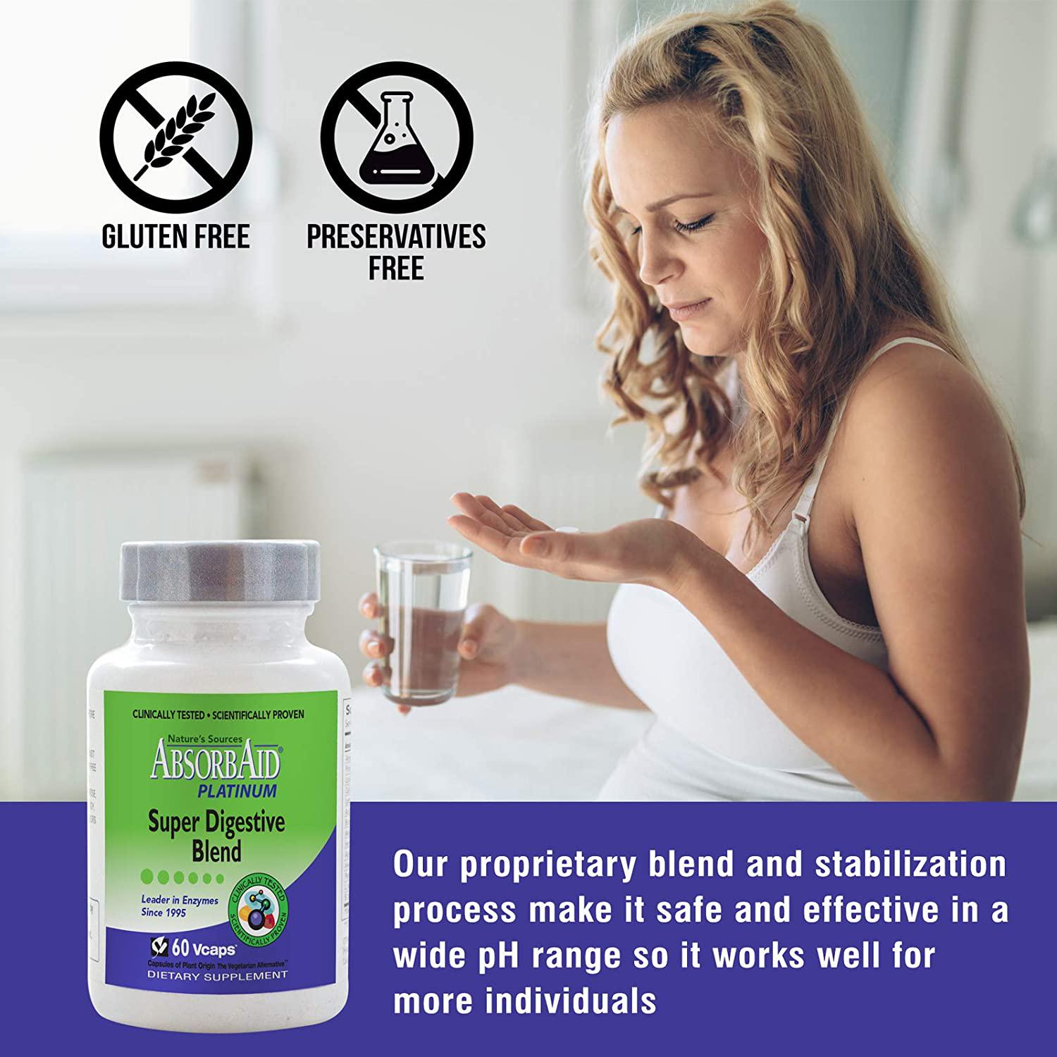 AbsorbAid Platinum- Super Digestive Blend A suggested solution for individuals with a vigorous, active lifestyle, a physically demanding job, individuals who eat more animal proteins and those who are recovering from an illness, AbsorbAid Platinum contains 12 active enzymes and two heat-stable probiotics that complement and help protect the immune system. Its super digestive blend breaks down all food groups and maximizes nutrient absorption from consumed food. It also helps allieviate digestive disturbances such as gas, bloating and acid indigestion.