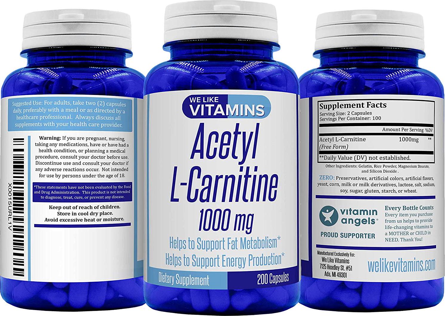 100 day supply, 1000mg, 200 capsules, acetyl l-carnitine, capsules, energy production, energy support, supplement