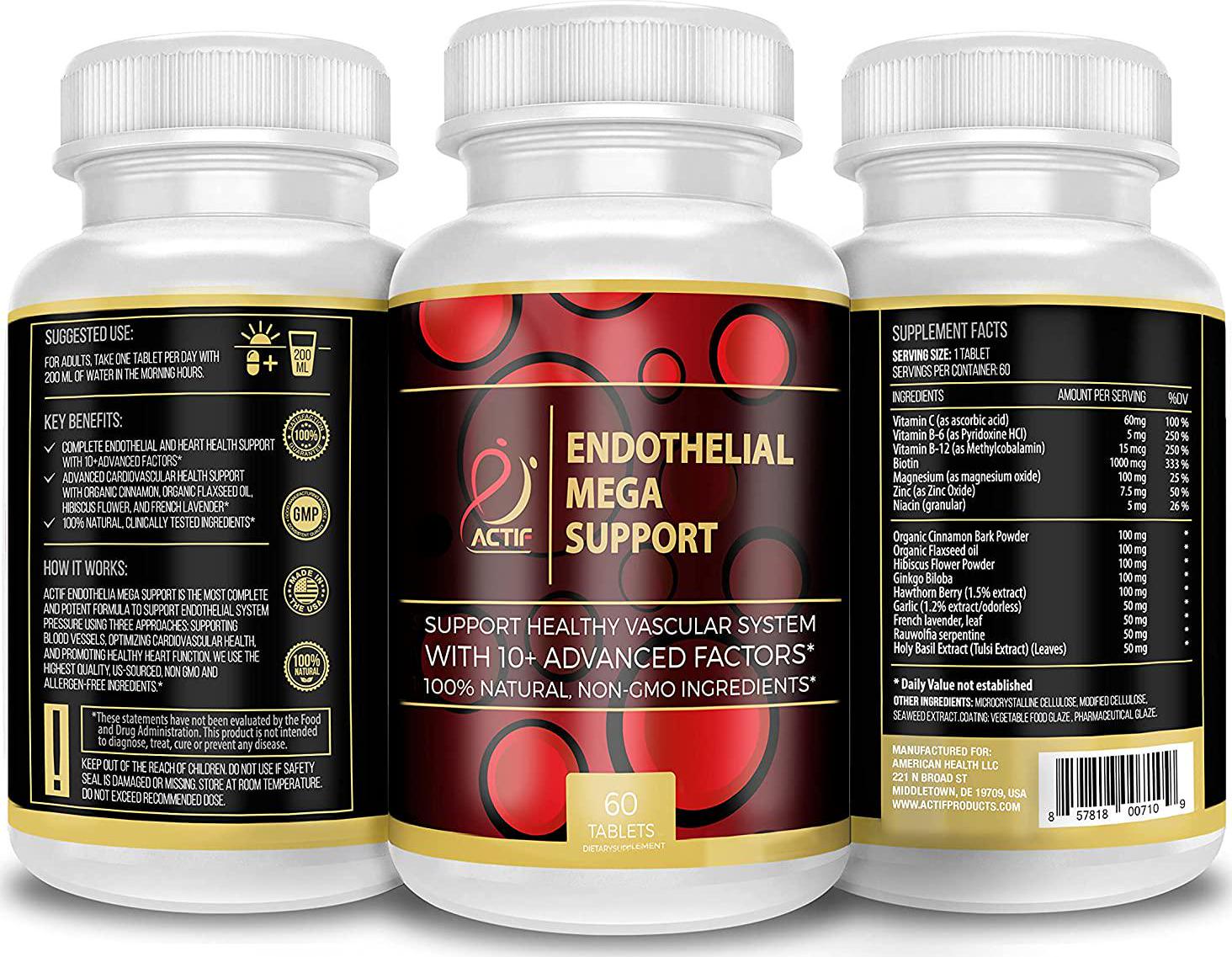 - Actif Endothelial Mega Support is the most complete and potent formula to endothelial using three approaches: maximizing antioxidant metabolism and vasodilation, optimizing endothelial transport, and promoting healthy vascular system function. Actif use the highest quality, US-sourced, non GMO and allergen-free ingredients.