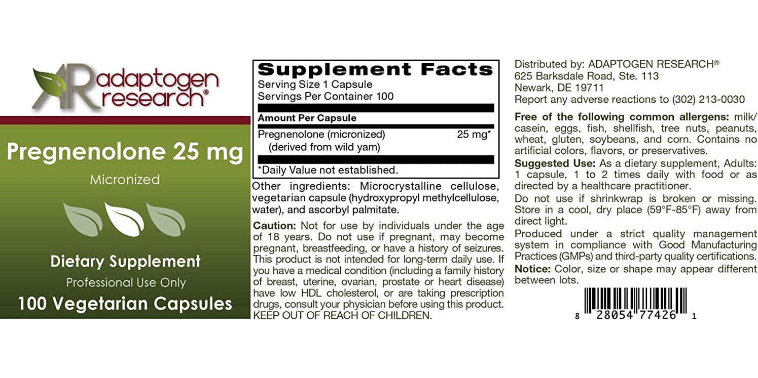 Adaptogen Research Pregnenolone 25mg Micronized Form Derived from Wild Yam | Highly Bioavailable and Micronized for Superior Absorption | Hypoallergenic | 100 Vegetarian Capsules