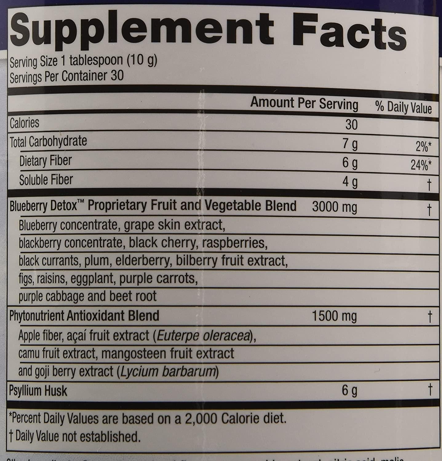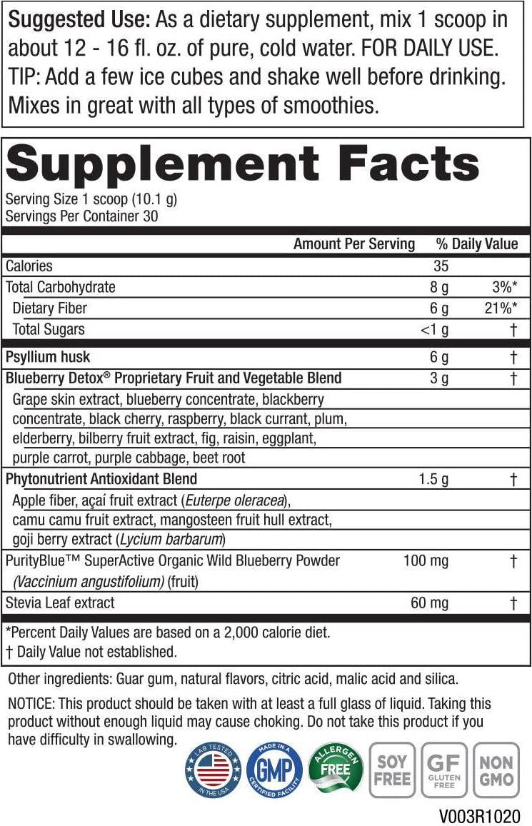 Plus, Blueberry Detox continues to bring you energizing phytonutrients from over 20 fruits, vegetables and assorted berries along with a full 6 grams of detoxifying, regularity promoting Prebiotic Fiber.* All in a great tasting, easy-to-use powder that mixes up in seconds!