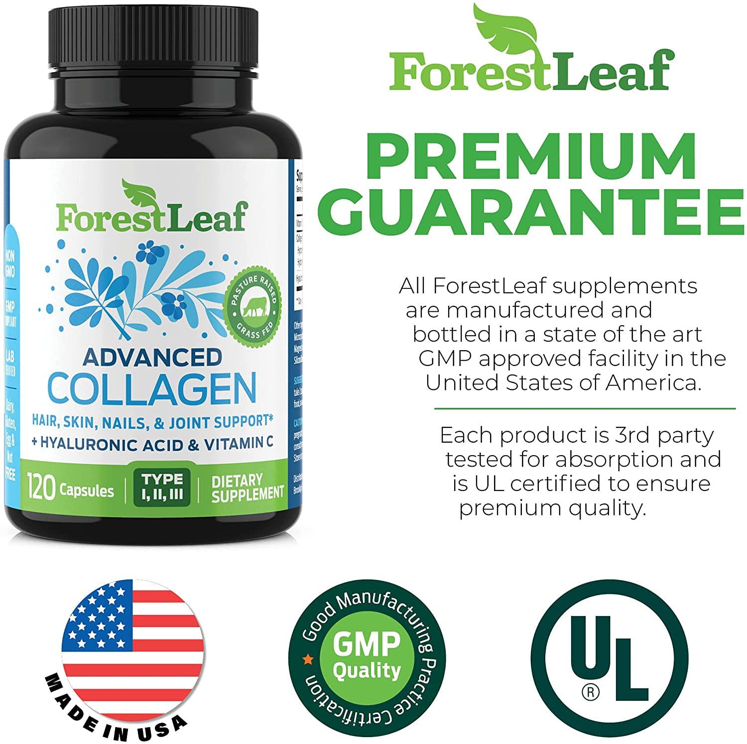 Advanced Collagen Supplement, Type 1, 2 and 3 with Hyaluronic Acid and Vitamin C - Anti Aging Joint Formula - Boosts Hair, Nails and Skin Health - 120 Veggie Capsules - by ForestLeaf