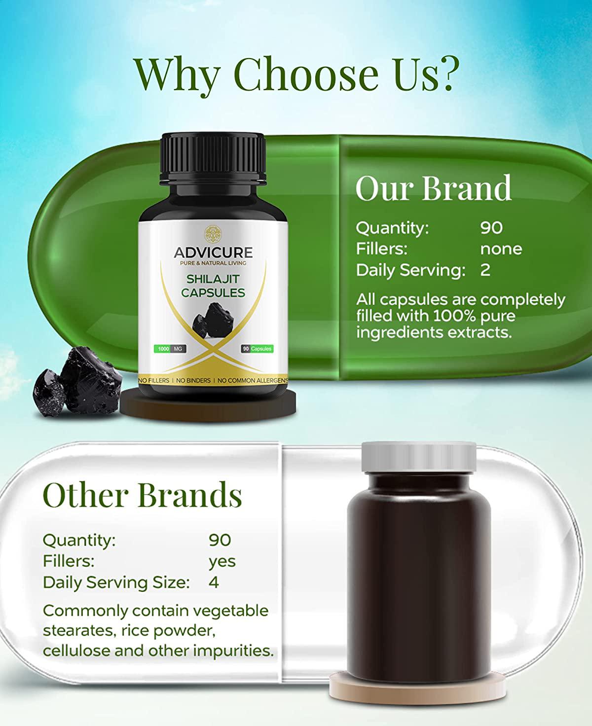 - PLETHORA OF HEALTH BENEFITS: Advicure’s Organic Shilajit Capsules are a great herbal supplement to get health benefits, especially for men. Regular intake allows men to age gracefully by having great skin, be more energetic, and have more stamina in everyday life. The supplement is rich in minerals and Fulvic acid.