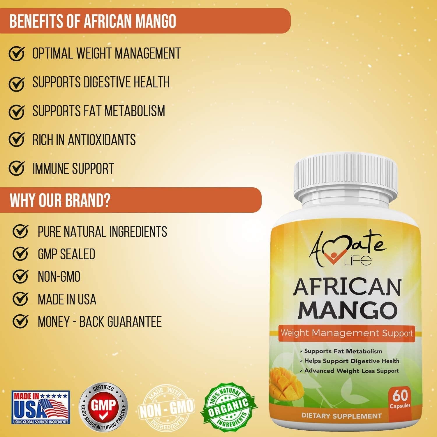 Amate Life American Mango Weight Management Support - 60 Capsules When it comes to our customer's satisfaction, we have one rule: settle for nothing but the best. Thats why we only work with premium quality ingredients and professional researchers that are guaranteed to deliver to our high expectations.