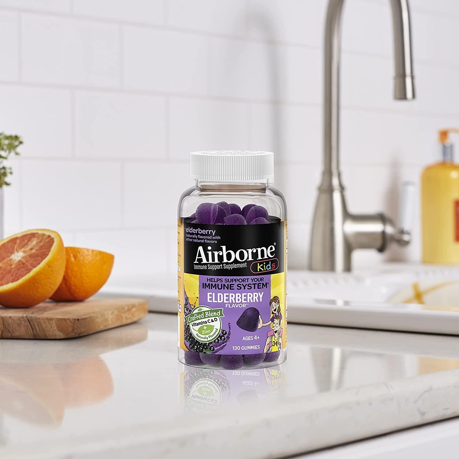 Airborne KIDS Elderberry + Vitamins and Zinc Gummies (130 count in a bottle), Gluten-Free Immune Support Supplement With Vitamins D and E