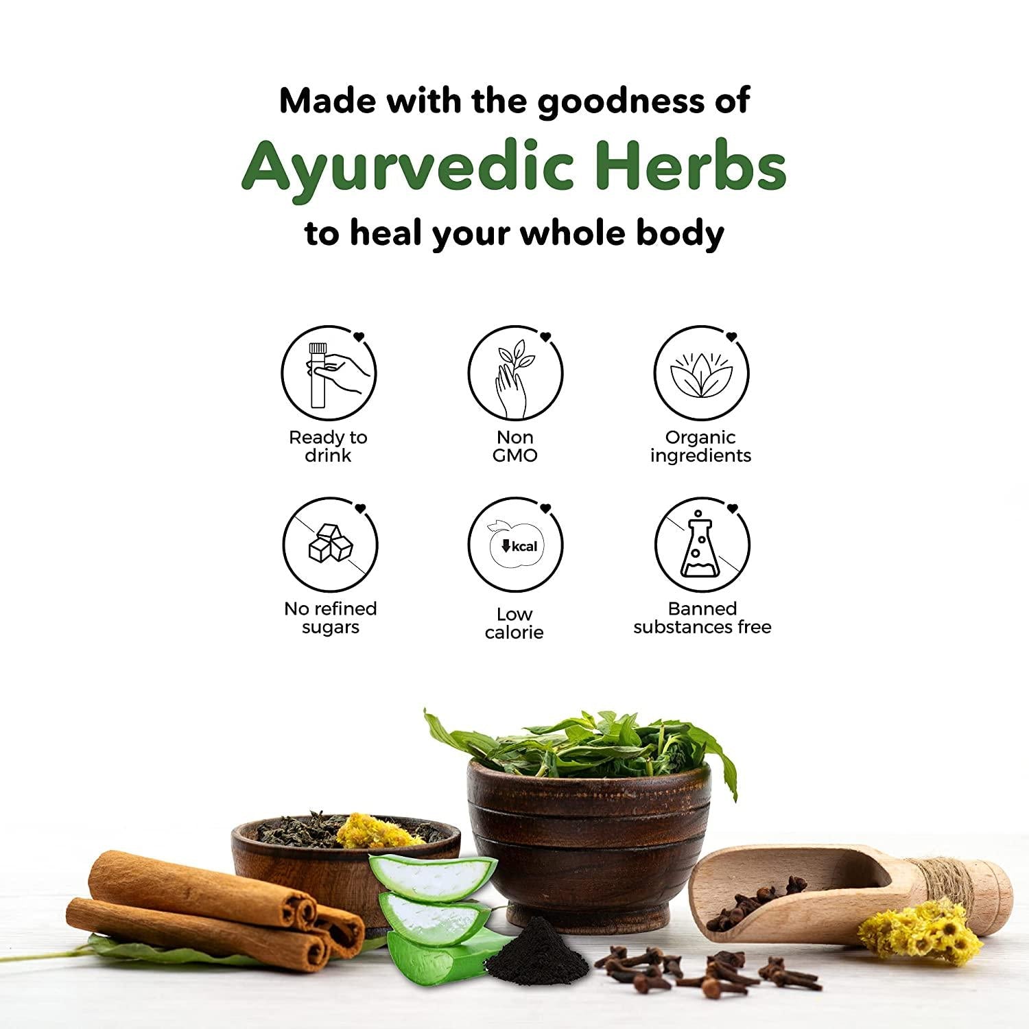 - Ayurvedic Health Shots Each bottle is formulated with the help of ancient Ayurvedic knowledge of herbs and fruits that work slowly on your body to give sustainable results