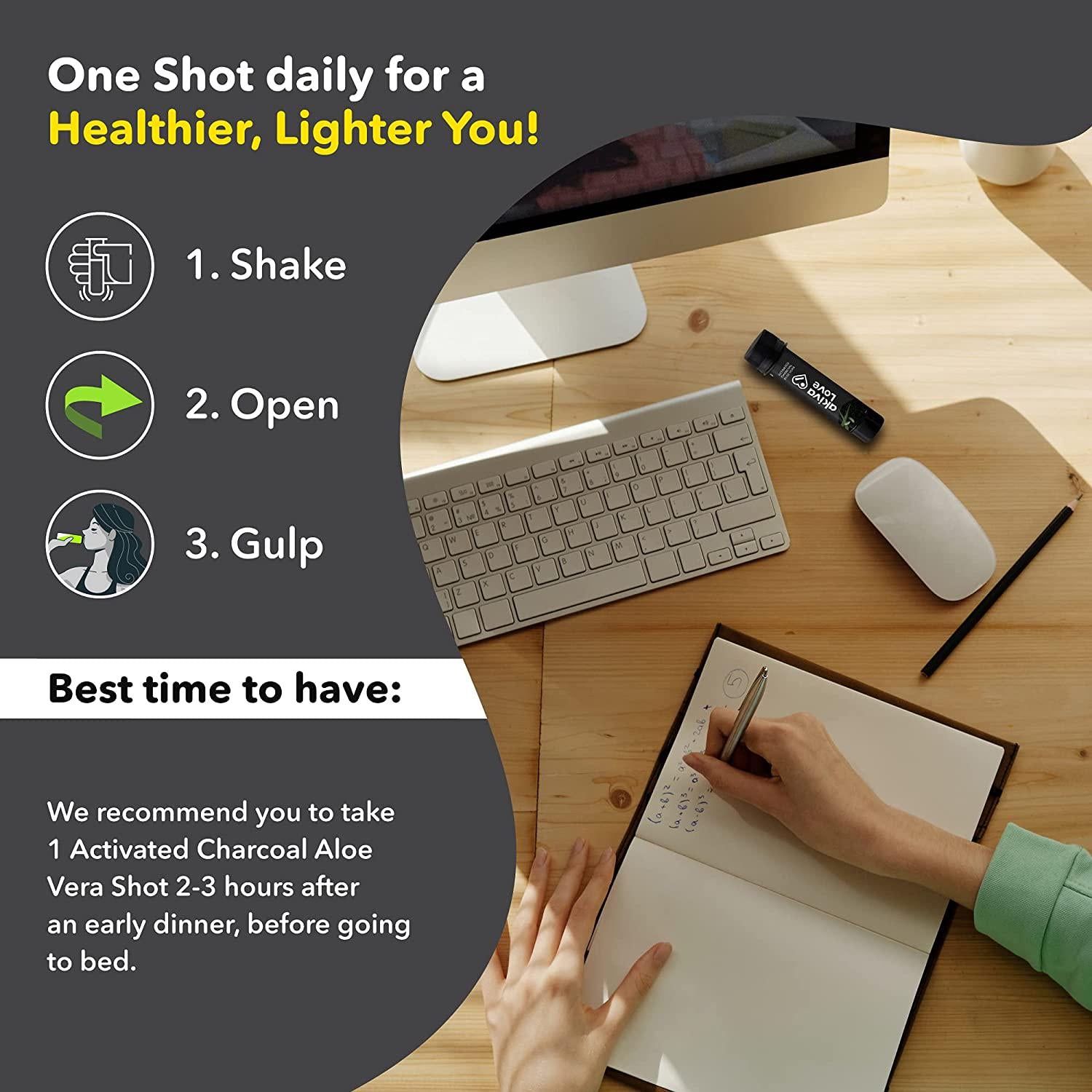 activated charcoal, aloe vera, bloating relief, constipation relief, detox shot, good gut health, usa