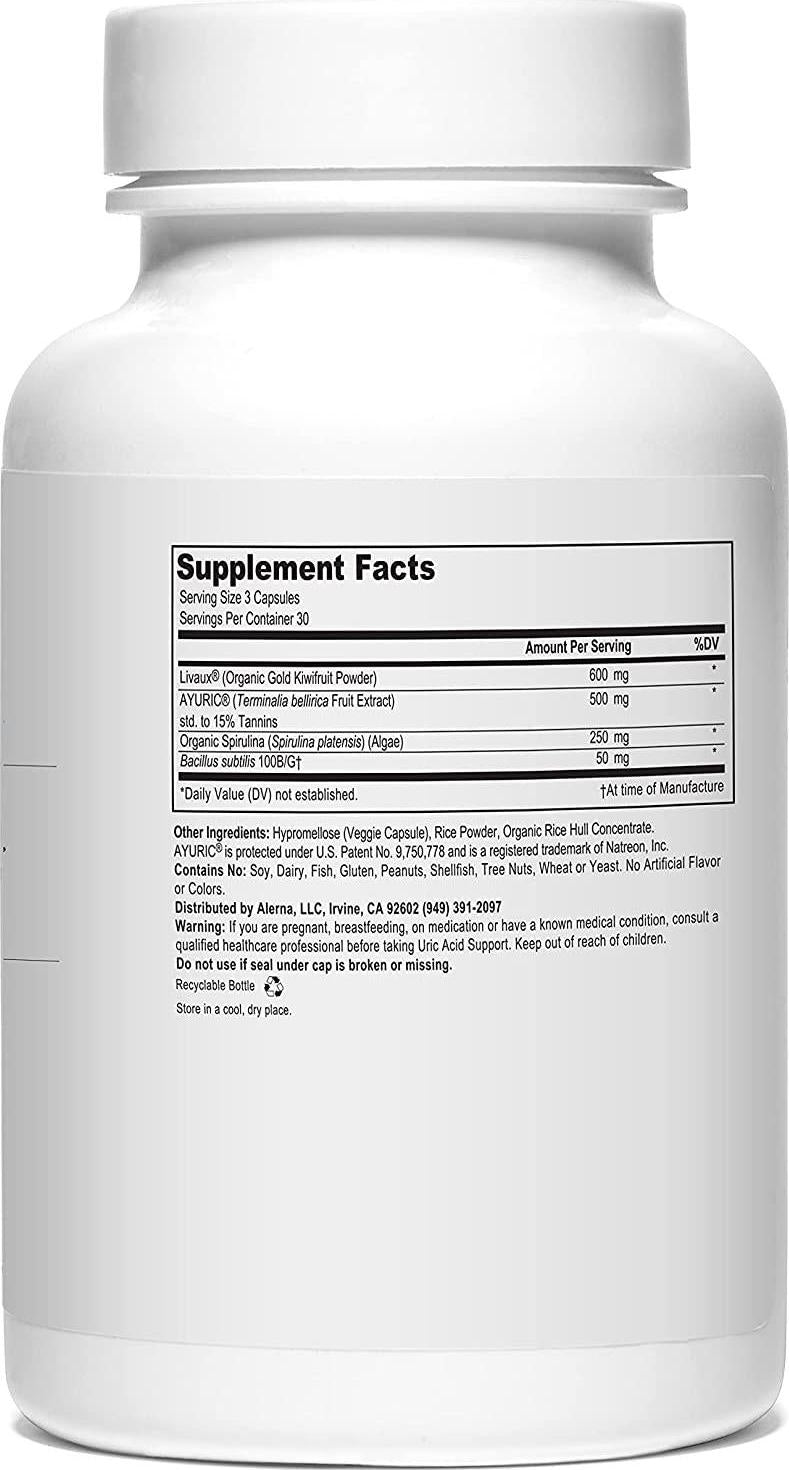 When too much uric acid circulates in the bloodstream, it causes inflammation and pain in the joints. As the crystals accumulate (usually in the big toe) around the affected joint, it becomes chronic and painful. However, with uric acid relief supplements containing probiotic, it gets manageable. Probiotics for Uric Acid Support is a unique formula with a high count of beneficial bacteria Bacillus subtilis 100 Billion/G+, plus LIVAUXs Organic Gold Kiwifruit Powder a bioactive ingredient that contains fibers and polyphenolics. Organic Spirulina provides antioxidant protection that may reduce inflammation and improve uric acid symptoms. Its an excellent source of vitamins, proteins, and fatty acids, which all help to normalize uric acid level. Both ingredients can help reduce inflammation, promote gut health, regulate immune function, balance gut microbiome, support digestion, and help metabolize purines and uric acid.