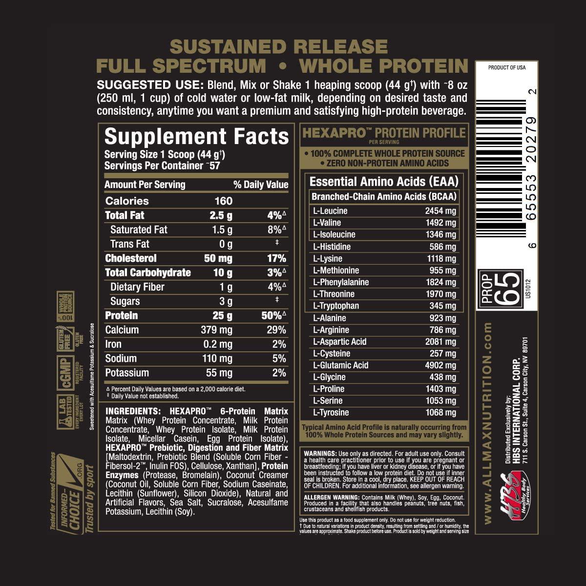 25g protein, 6-protein blend, allmax hexapro, french vanilla, gluten-free, lab tested