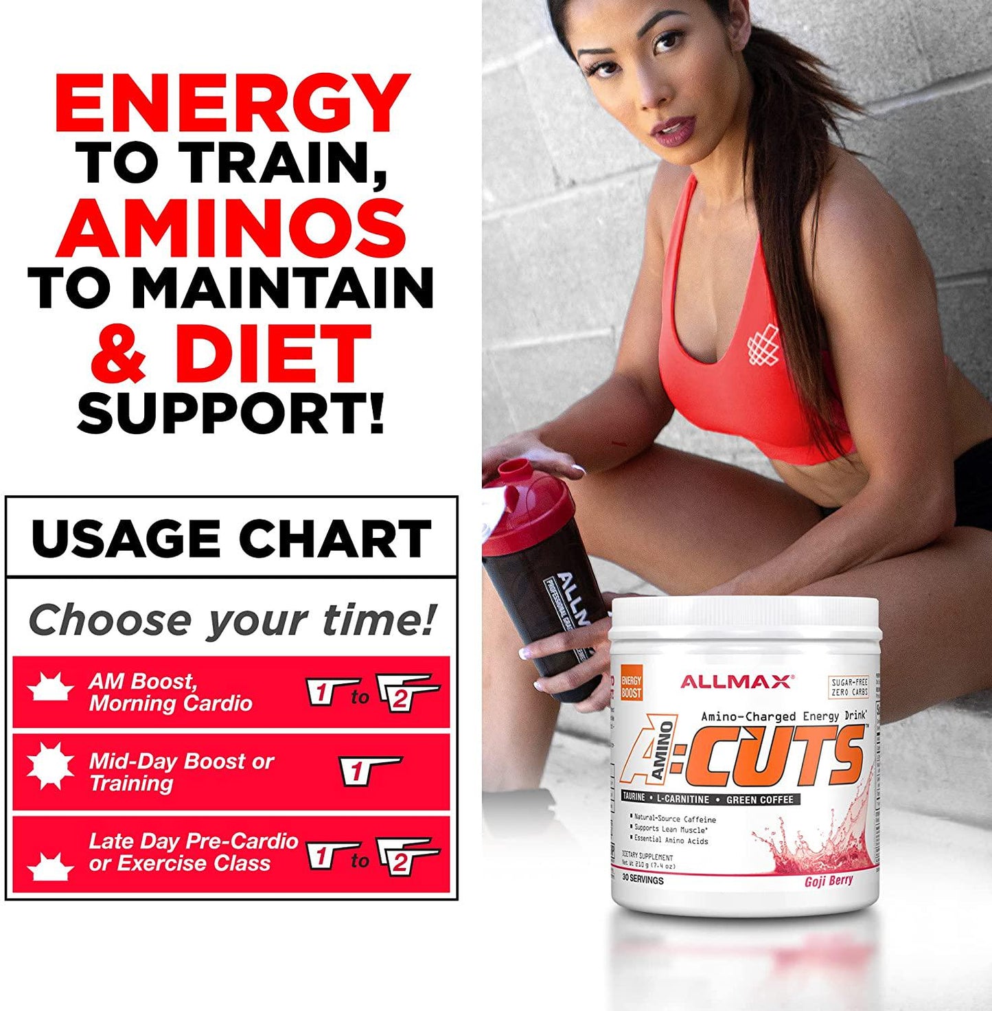 allmax nutrition aminocuts, amino-charged energy drink, c.l.a, goji berry martini, natural caffeine, taurine, usa