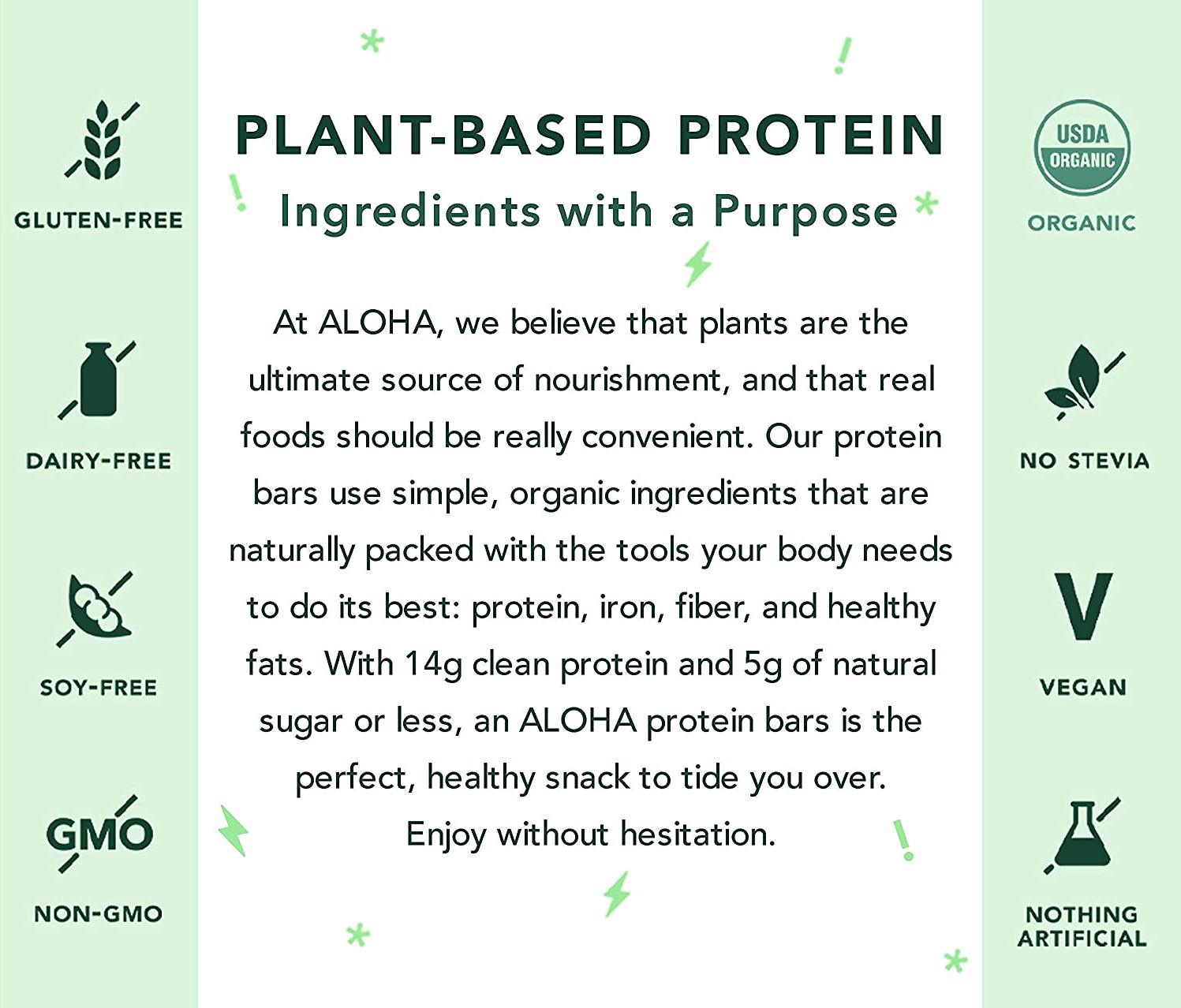 - ALOHA Protein Bars are Seriously Great Tasting, Vegan, Organic, Non-GMO, Gluten-Free, Certified USDA Organic, Kosher, Soy-Free, Dairy-Free, Stevia-Free, High Fiber and Paleo Friendly